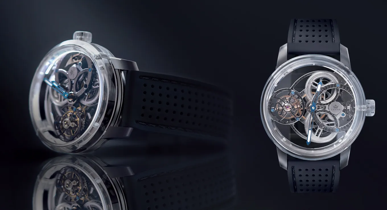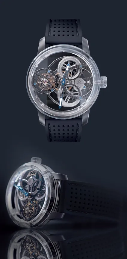 Все механизмы турбийонах в часах коллекции Space Tornado открыты. Любуйтесь на работу обычного, двойного и парящего турбийона в этих сложных изобретениях часового гения.