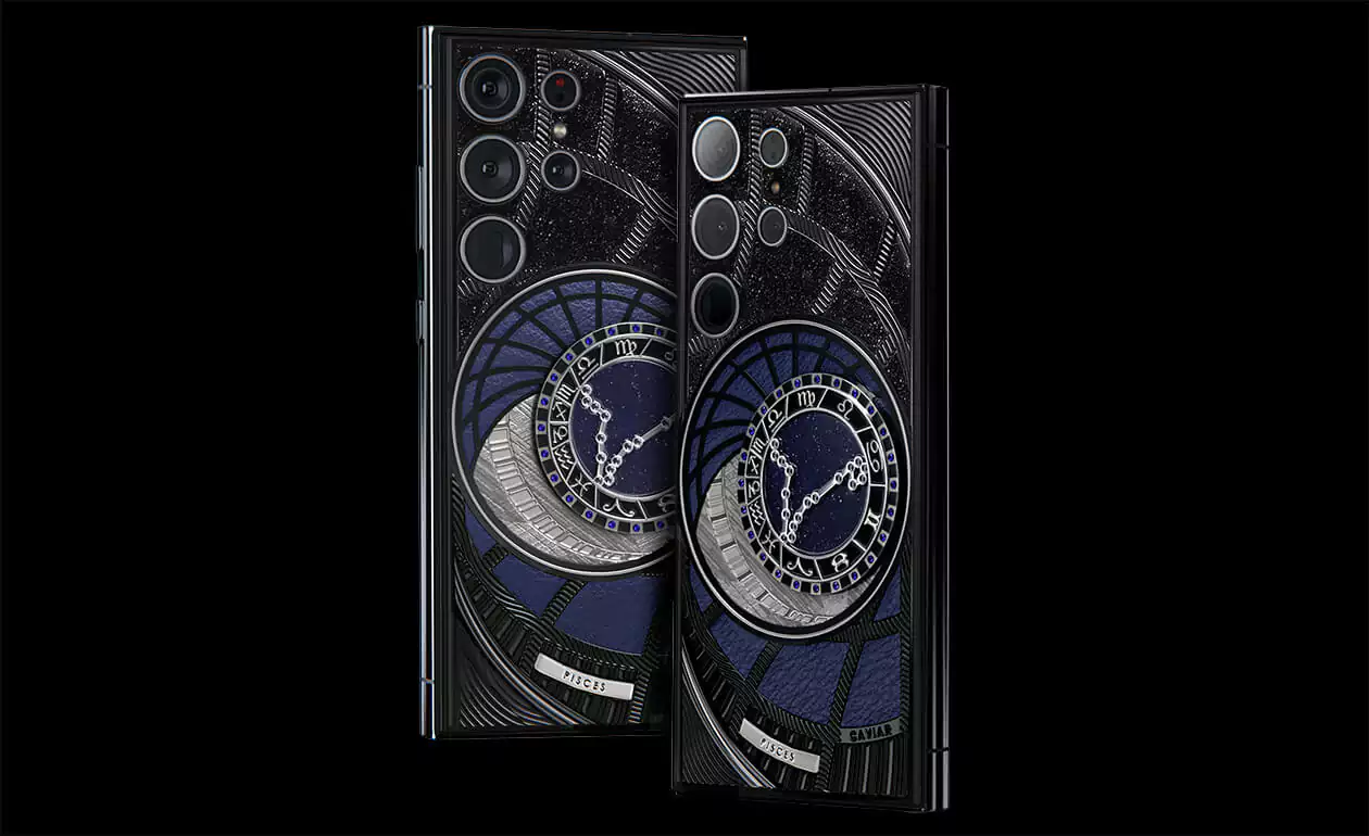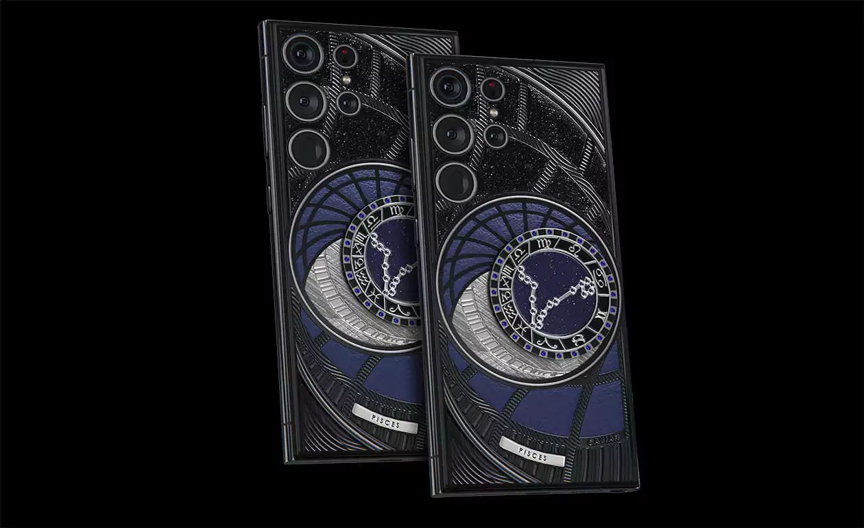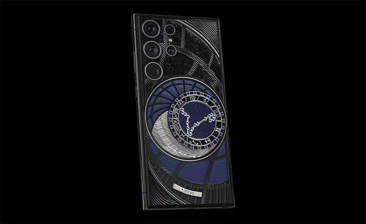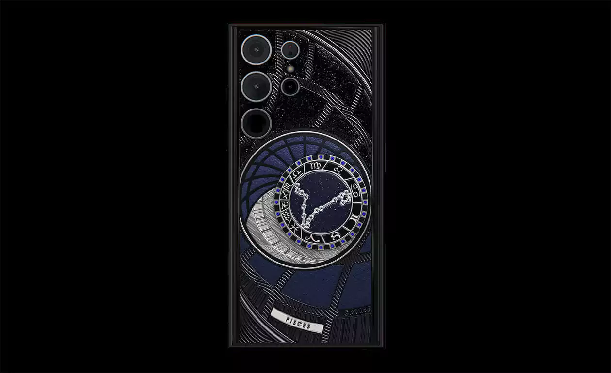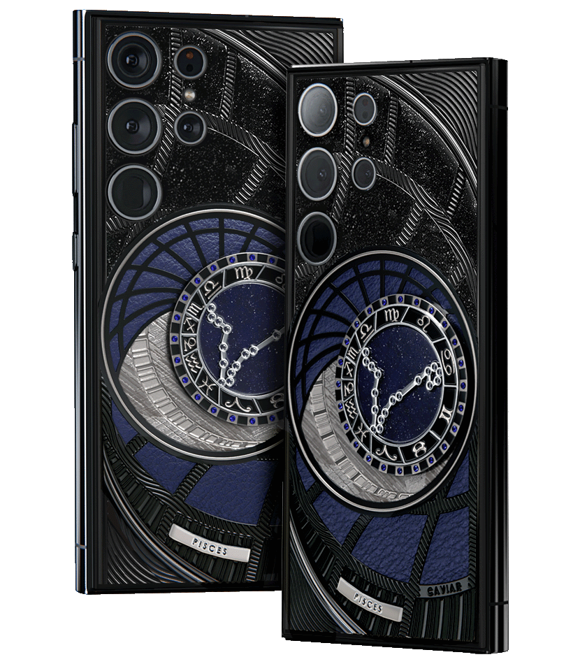 Caviar создал поэму, посвященную тем, кому покровительствует созвездие, формирующее на небесах образ двух рыб. Мы представляем вам Pisces. Корпус этого смартфона украшает небесный свод с изображением созвездия Рыб. Это панно, состоящее из 24 сапфиров, создано на черном титане с PVD-покрытием. Мы подчеркнули блеск сапфировой россыпи, используя синий композит и завершили композицию фрагментом метеорита на телячьей коже в ярком оттенке индиго.