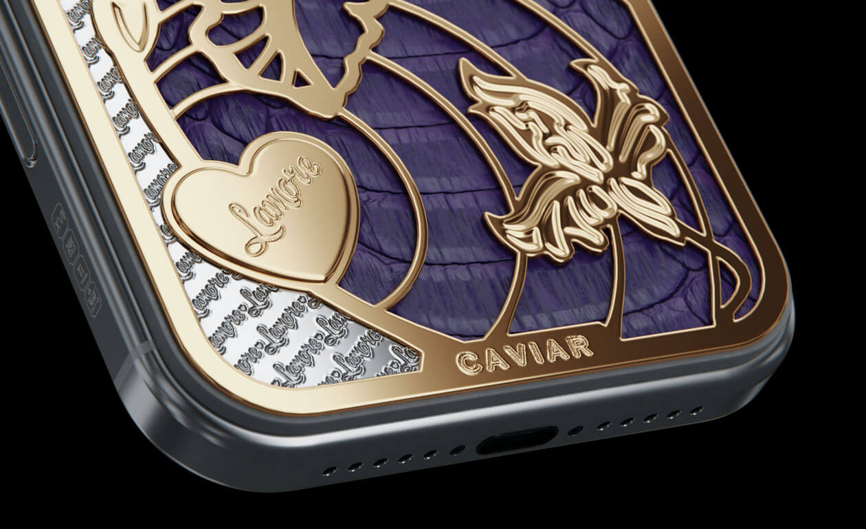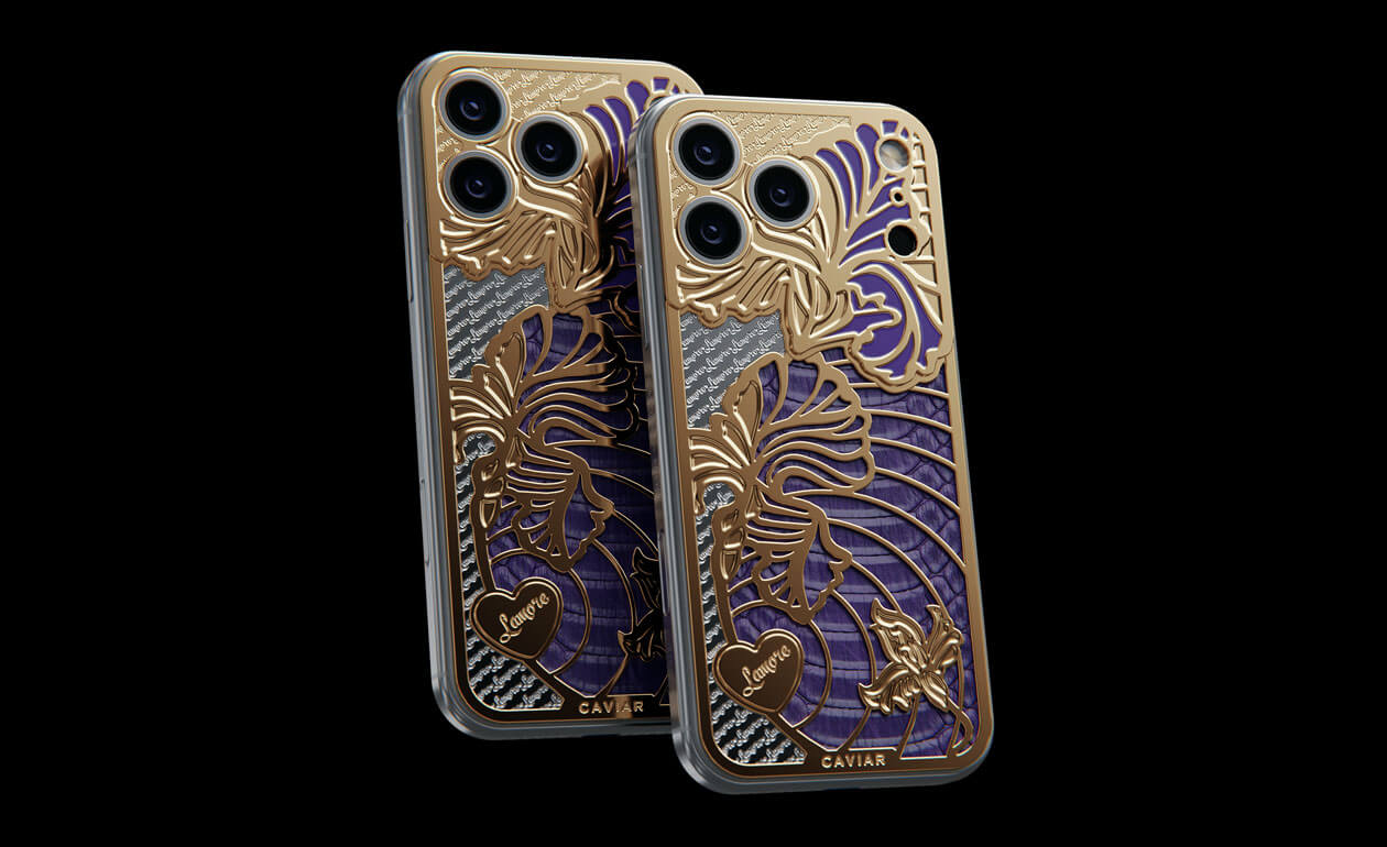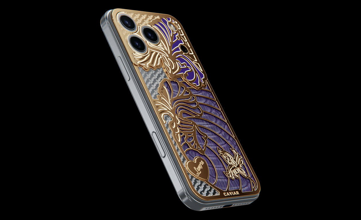 Нежный ирис расцвел на корпусе iPhone. Ювелирный дизайн, украшенный лепестками из фиолетовой кожи питона.
