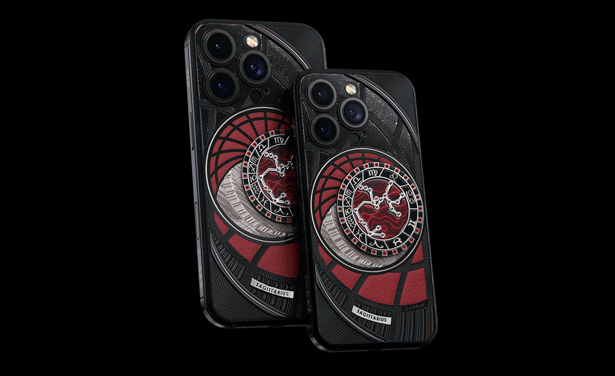 Стрельцы, сегодня мы представляем вам Sagitarius. На корпусе смартфона есть небесный свод с вашими звездами. Это панно из 24 рубинов, созданное на черном титане с PVD-покрытием. Мы подчеркнули сияние рубиновой россыпи с помощью пластины из красного композита и завершили композицию фрагментом метеорита на телячьей коже в ярком карминовом оттенке.