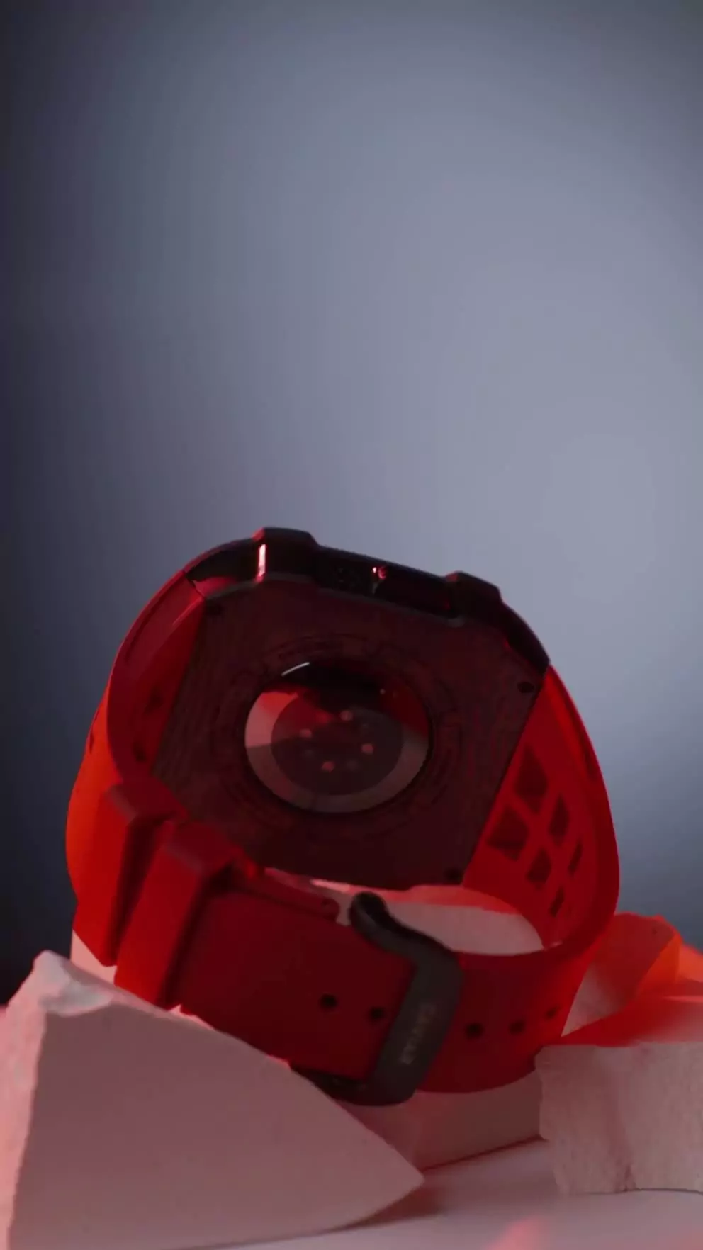 Ремешок: Фактурный каучуковый ремешок красного цвета с двойной раскладывающейся застежкой.