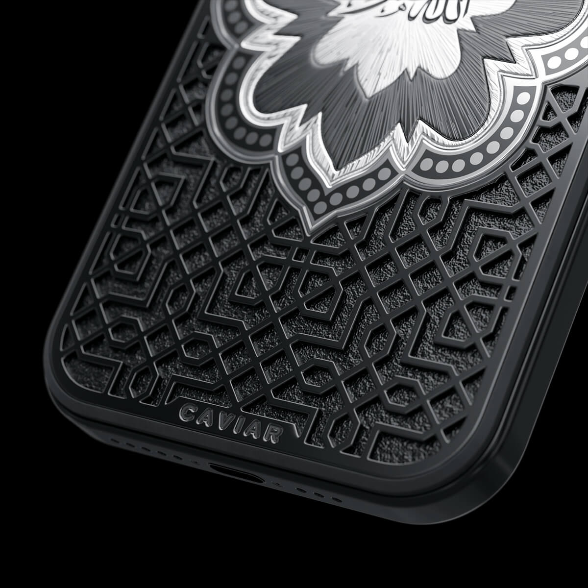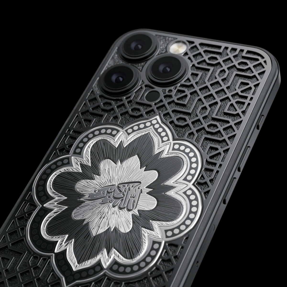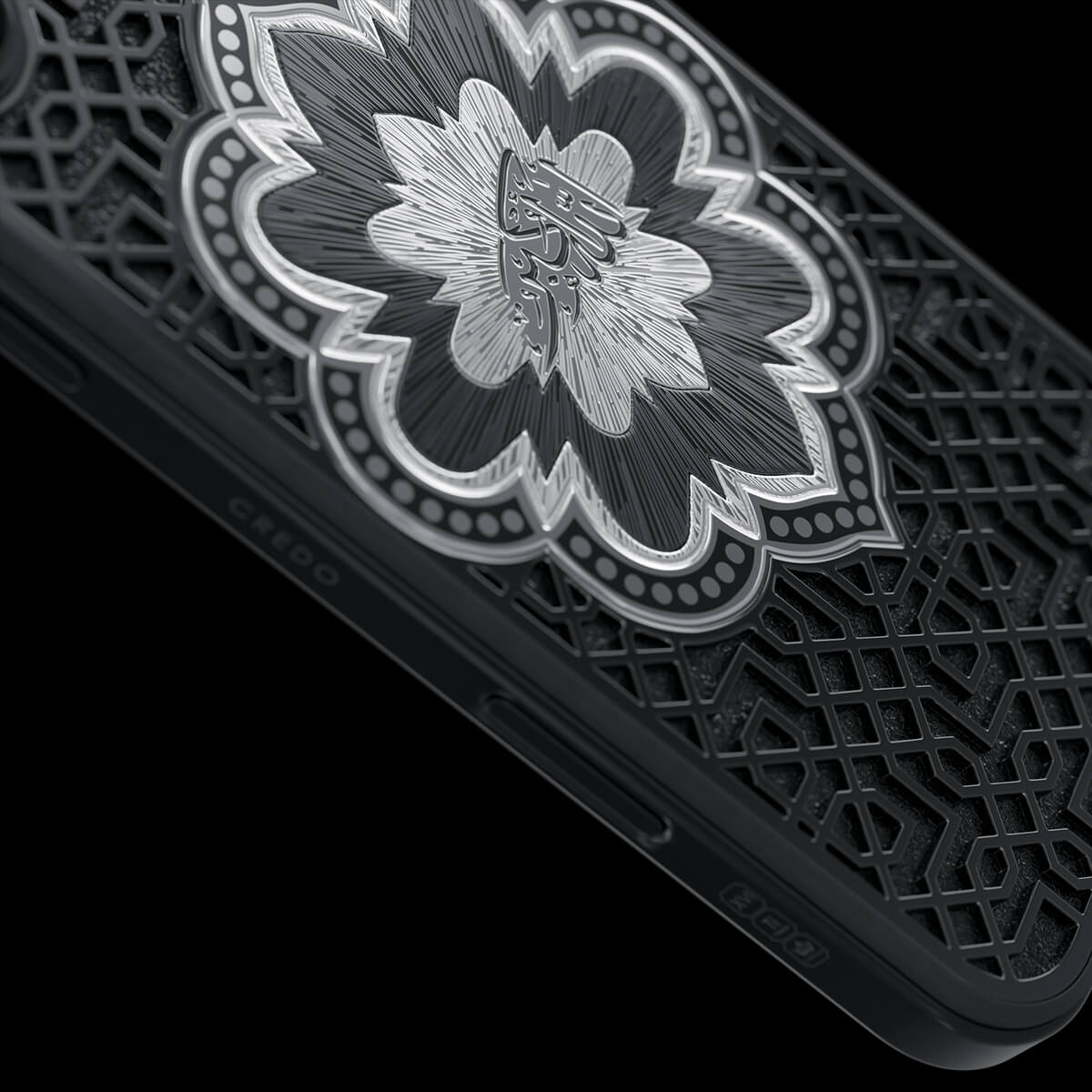 Представляем смартфон «Почитание». Центральный элемент дизайна — восточный орнамент в форме цветка, внутри которого выгравирована надпись «Аллах Велик» на арабском языке. Модель выполнена в минималистичной цветовой гамме — черное и серебро — которая подчеркивает благородство и глубину символики.