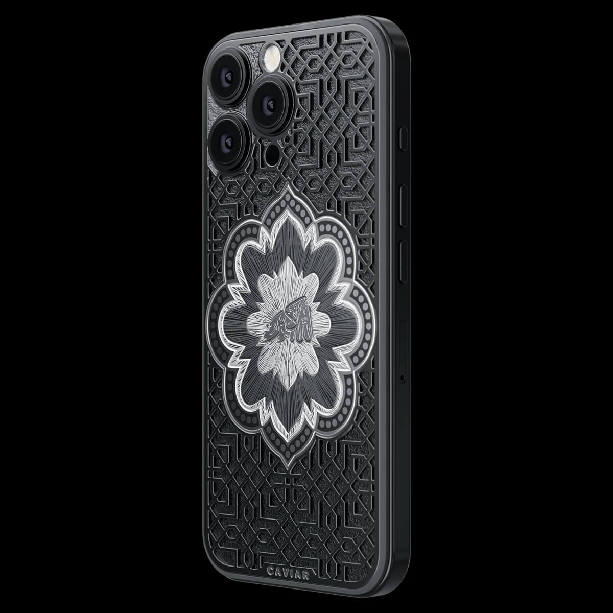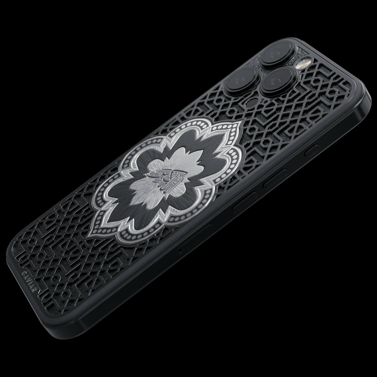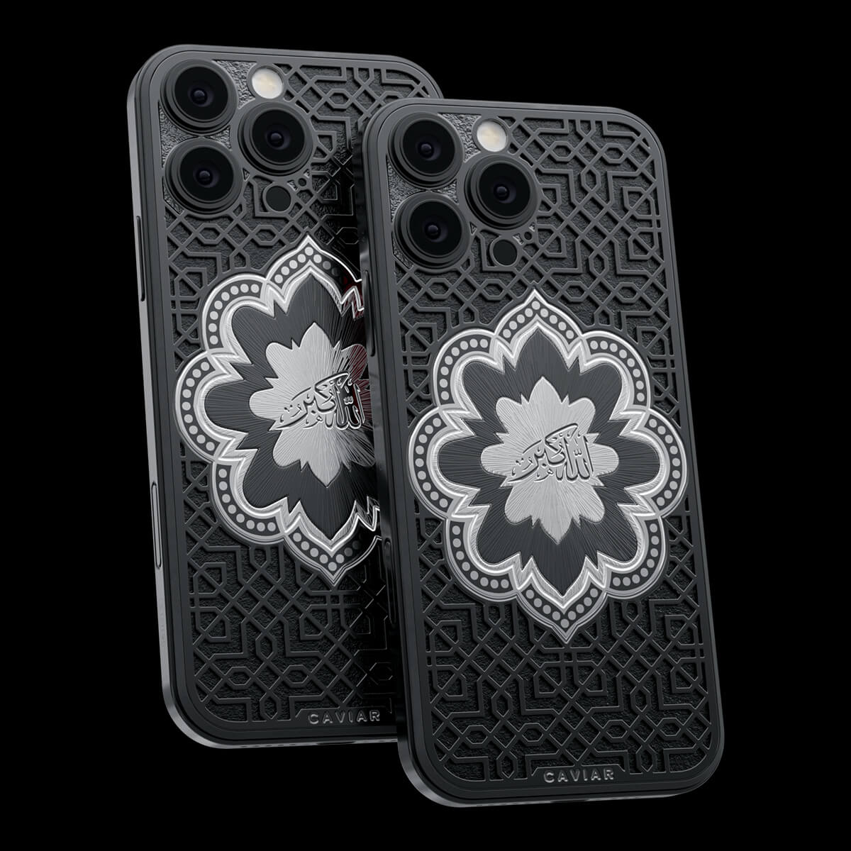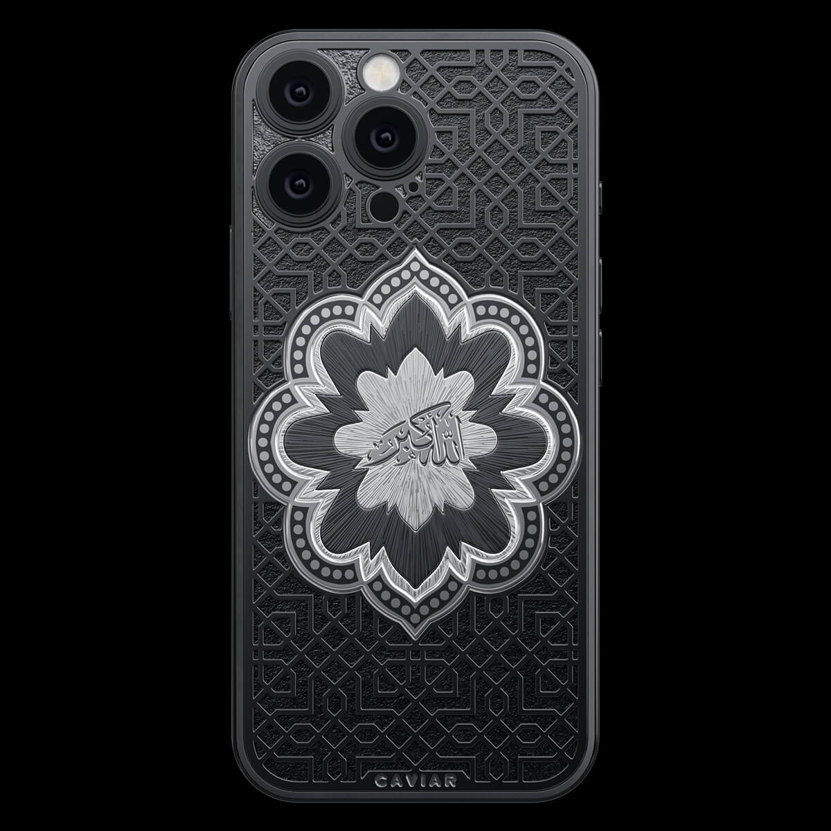 Представляем смартфон «Почитание». Центральный элемент дизайна — восточный орнамент в форме цветка, внутри которого выгравирована надпись «Аллах Велик» на арабском языке. Модель выполнена в минималистичной цветовой гамме — черное и серебро — которая подчеркивает благородство и глубину символики.