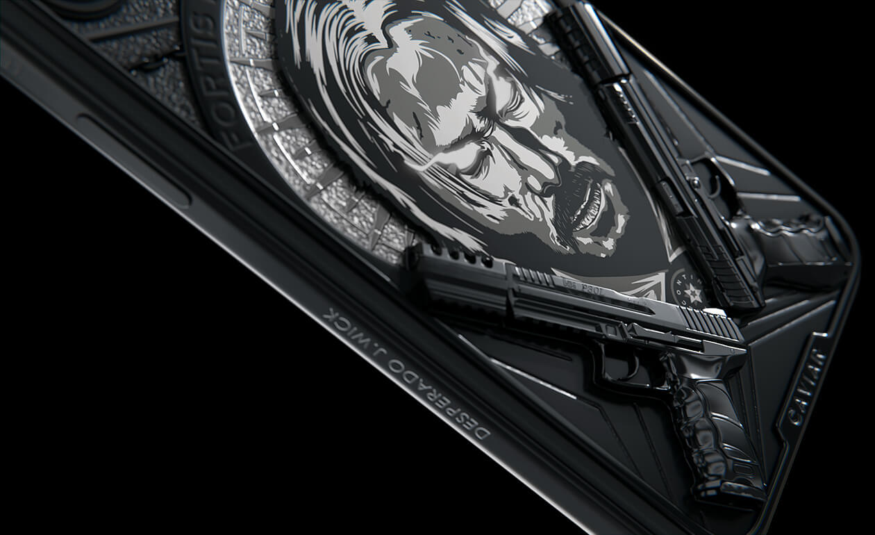Дизайн: Лазерная гравировка с портретом Джона Уика на титановом корпусе. Ореол вокруг головы выполнен из титана.