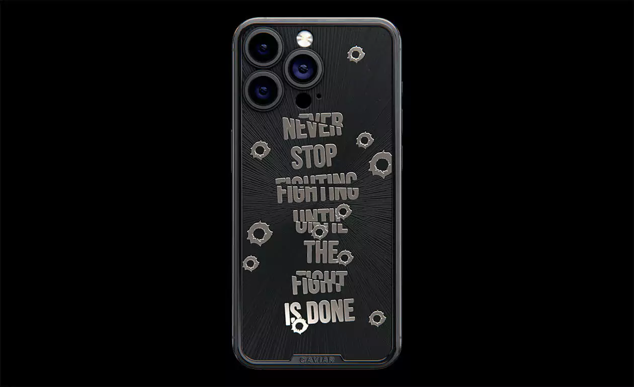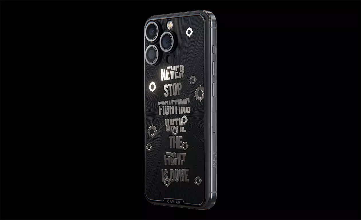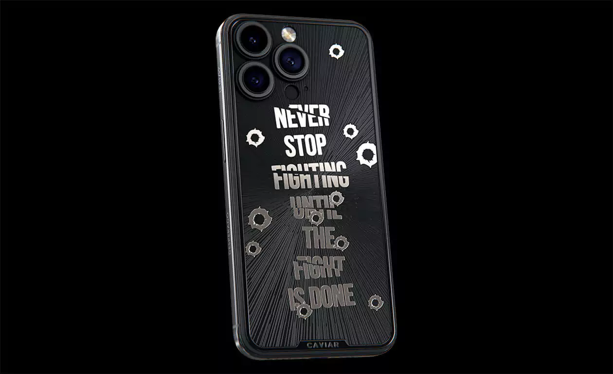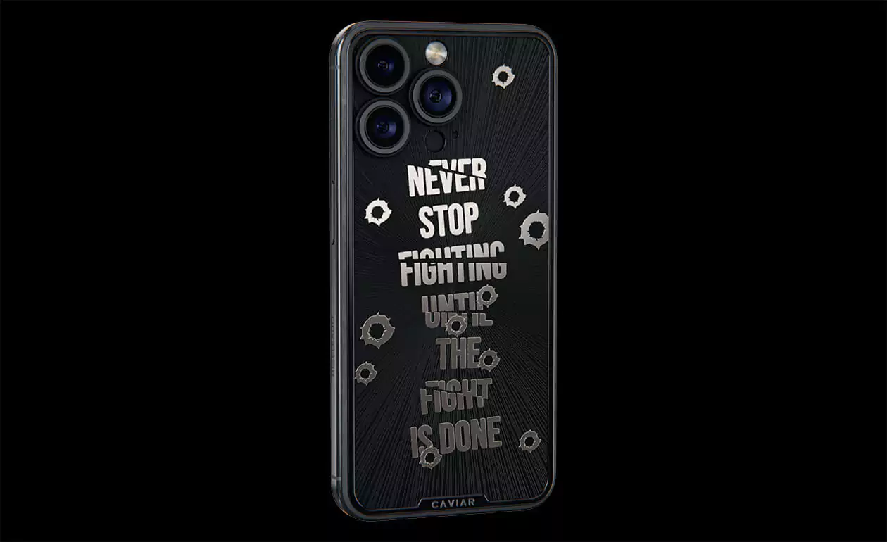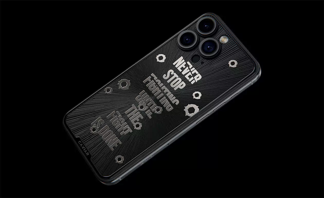 Дизайнеры Caviar создал истинный символ настойчивости и неумолимой воли – iPhone 15 Pro Capone. Холодный, сдержанный дизайн титанового корпуса воплощает мужественность и авторитет. Стилизованные изображения пулевых отверстий, обрамляющие мантру "Не переставай бороться, пока бой не окончен!" делают этот телефон настоящим талисманом тех, кто продолжает сражаться даже перед лицом трудностей. Станьте обладателем модели Capone уже сегодня, и пусть каждый встречный знает, что нет в мире силы, способной остановить вас.