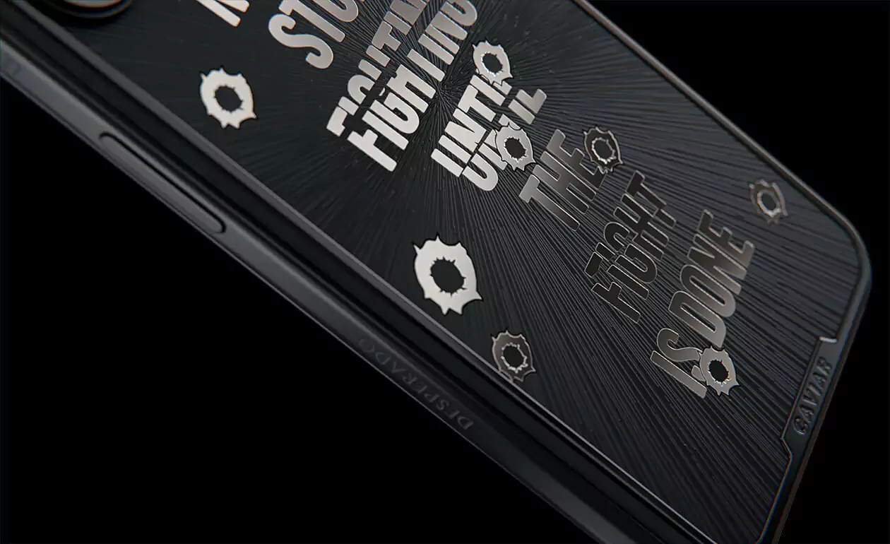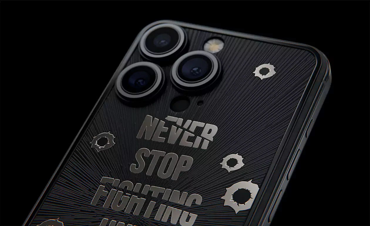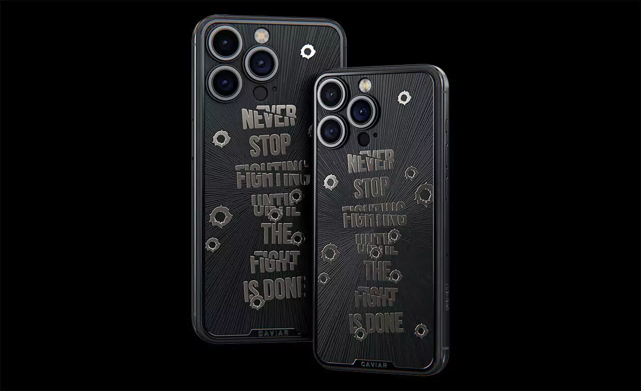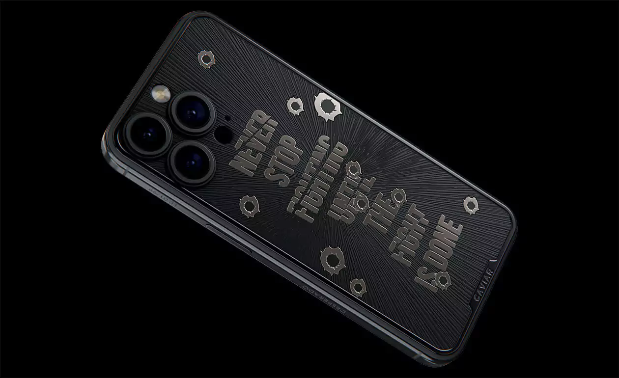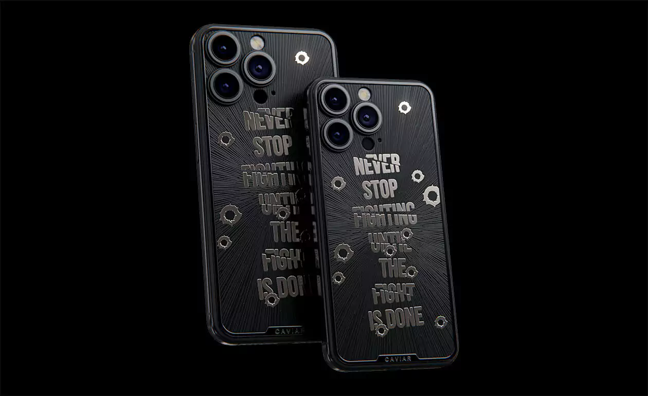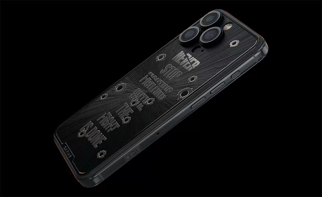 Дизайнеры Caviar создал истинный символ настойчивости и неумолимой воли – iPhone 15 Pro Capone. Холодный, сдержанный дизайн титанового корпуса воплощает мужественность и авторитет. Стилизованные изображения пулевых отверстий, обрамляющие мантру "Не переставай бороться, пока бой не окончен!" делают этот телефон настоящим талисманом тех, кто продолжает сражаться даже перед лицом трудностей. Станьте обладателем модели Capone уже сегодня, и пусть каждый встречный знает, что нет в мире силы, способной остановить вас.