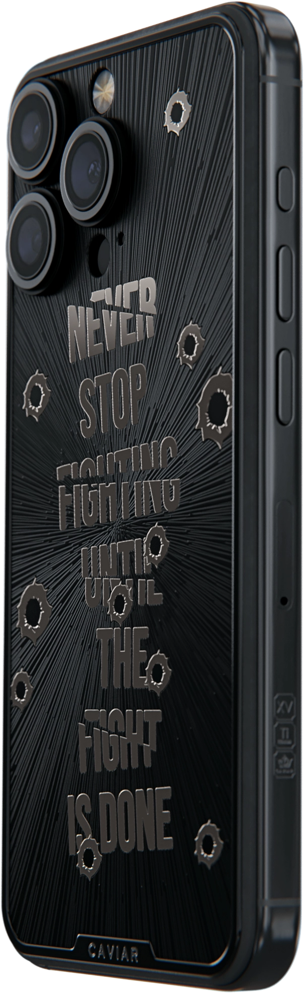 Воплощение смелости и боевого духа. Создан для мужчин, ценящих стойкость и отвагу, смартфон сочетает черный титан с пулевыми отверстиями и вдохновляющую цитату "Не переставай бороться, пока бой не окончен" отсылающую к фильму "Неприкасаемые".