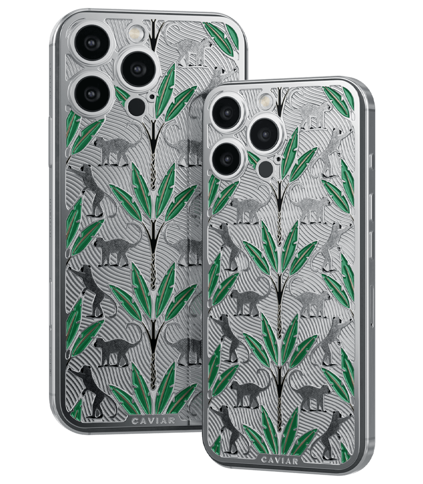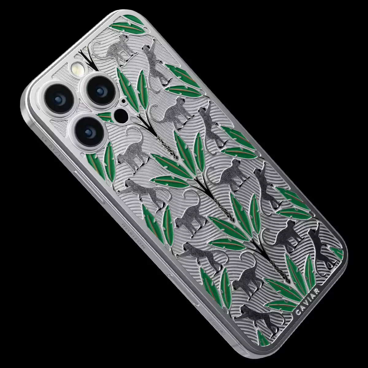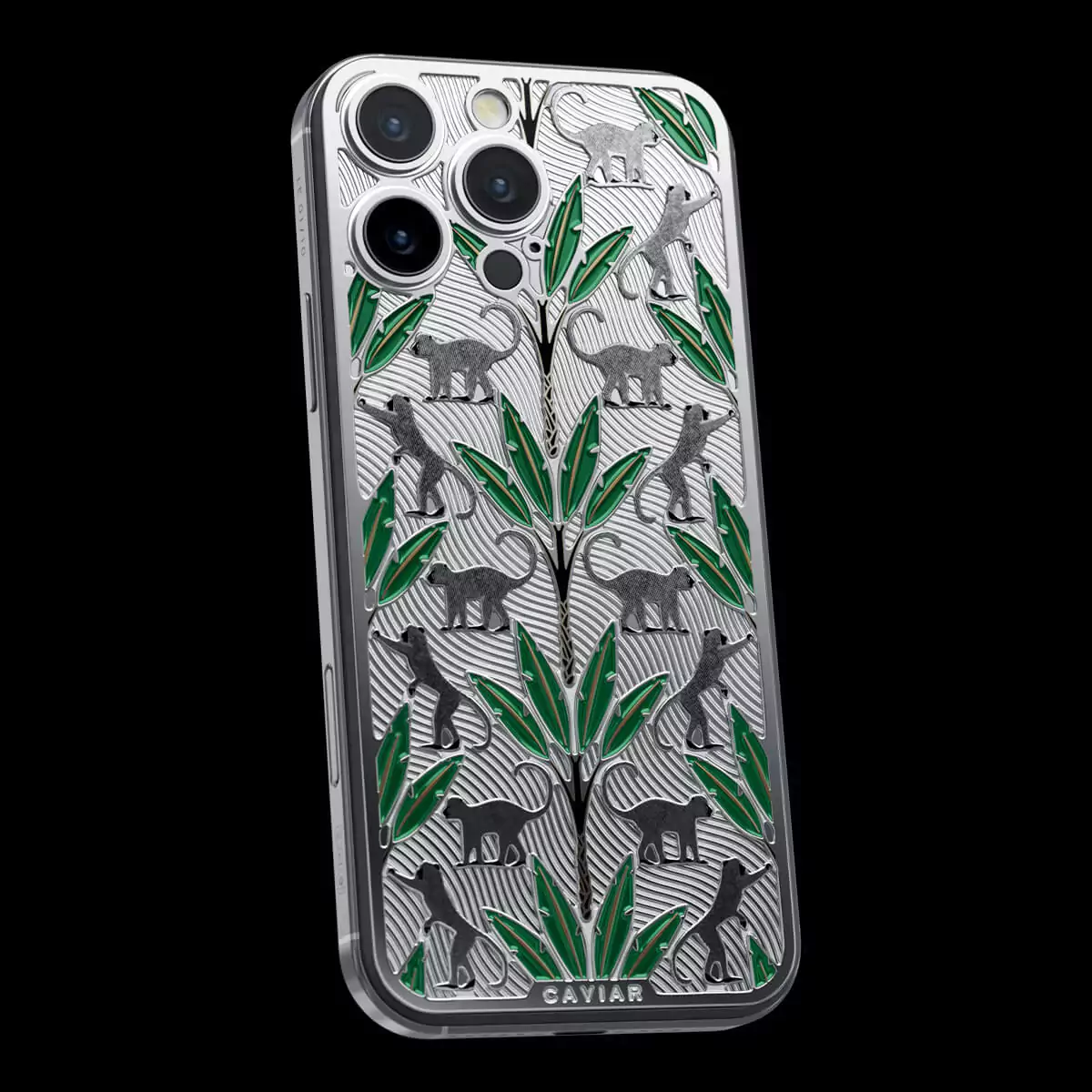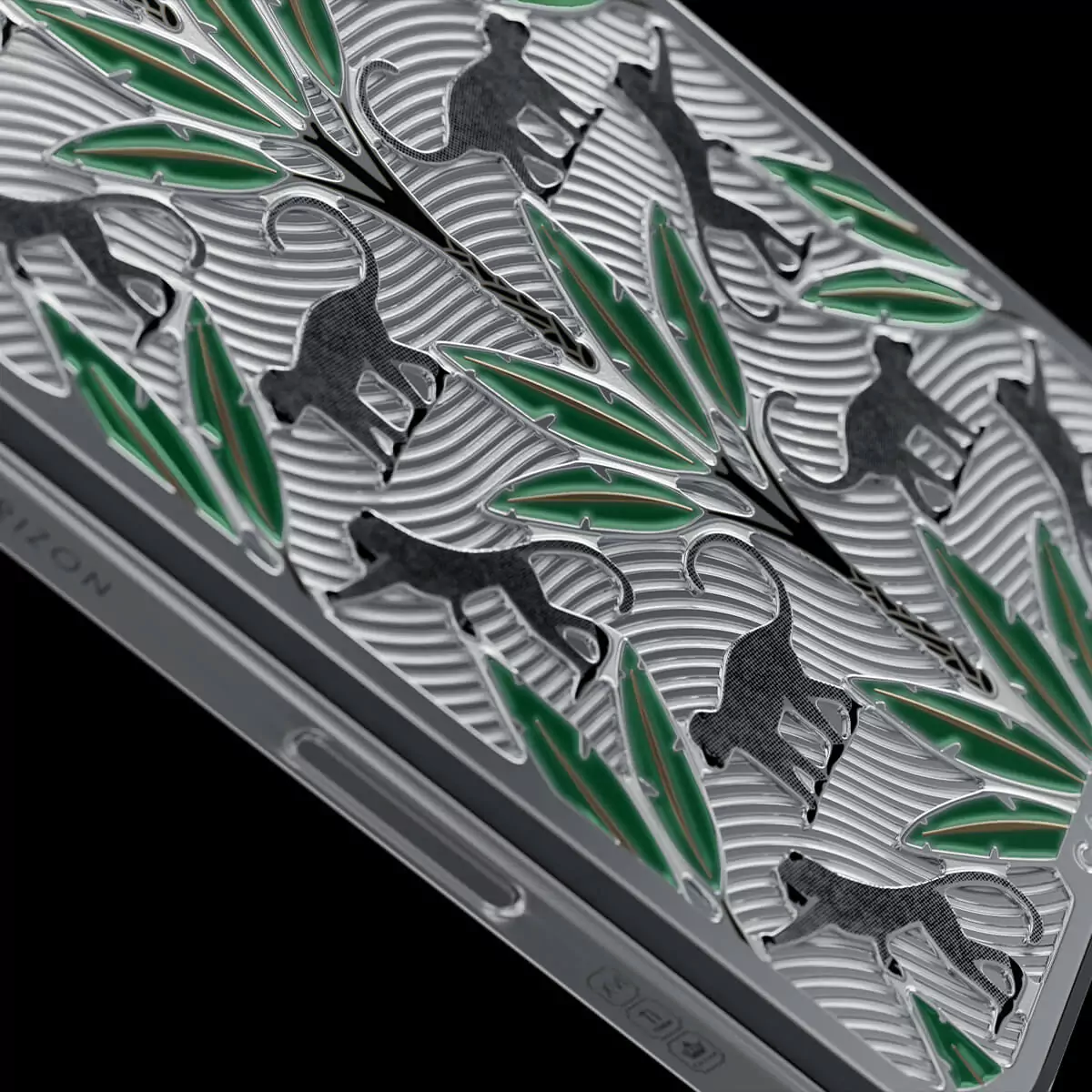 Титановая поверхность Gibraltar от Caviar словно высечена самой природой – на ней выгравированы гордые силуэты обезьян-маготов, которые стали символами этого места. Черные стволы пальм дополняют картину, а изумрудные эмалевые листья оживляют дизайн.