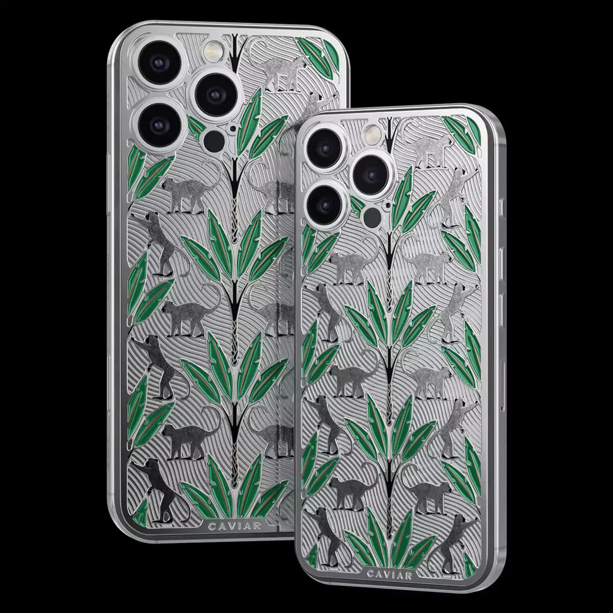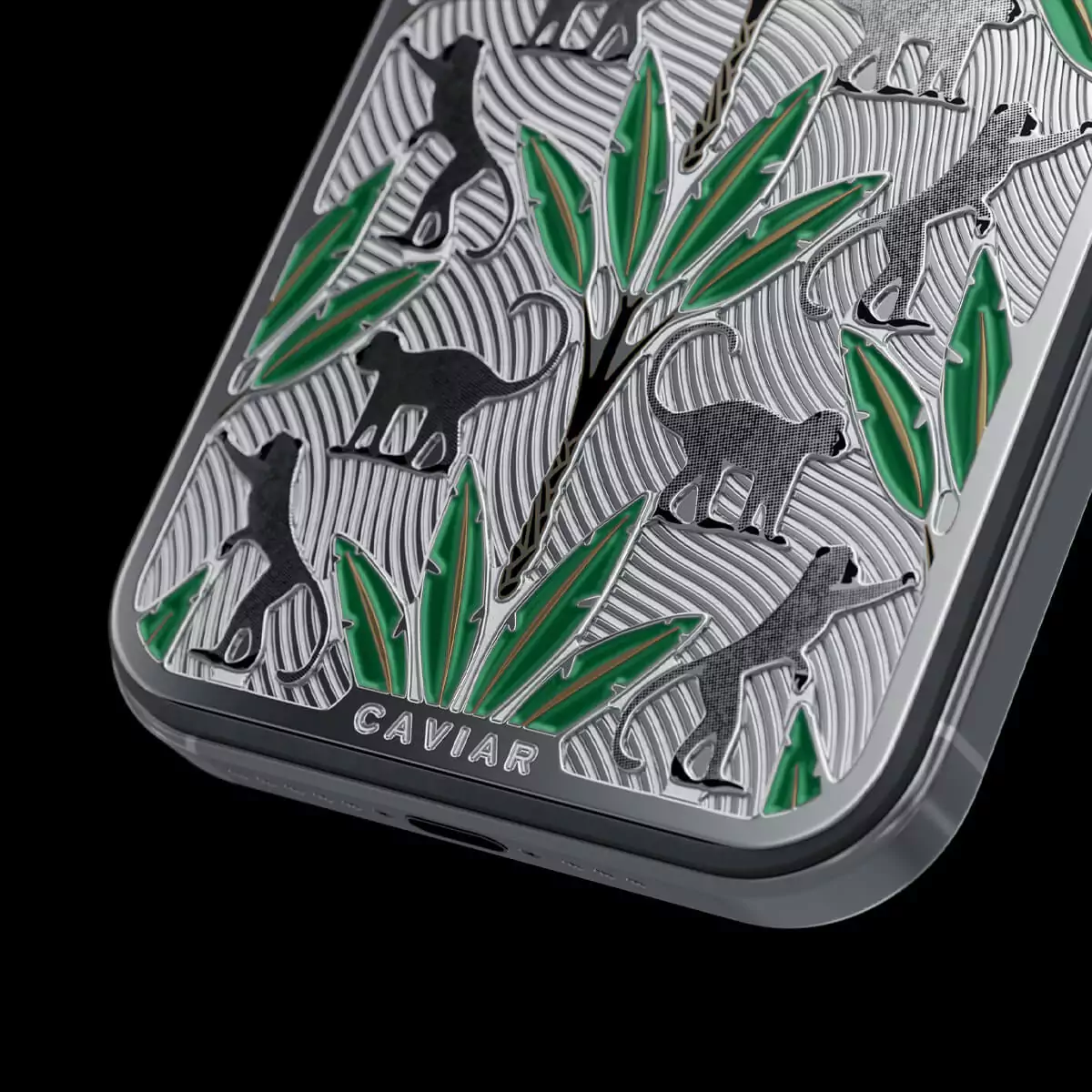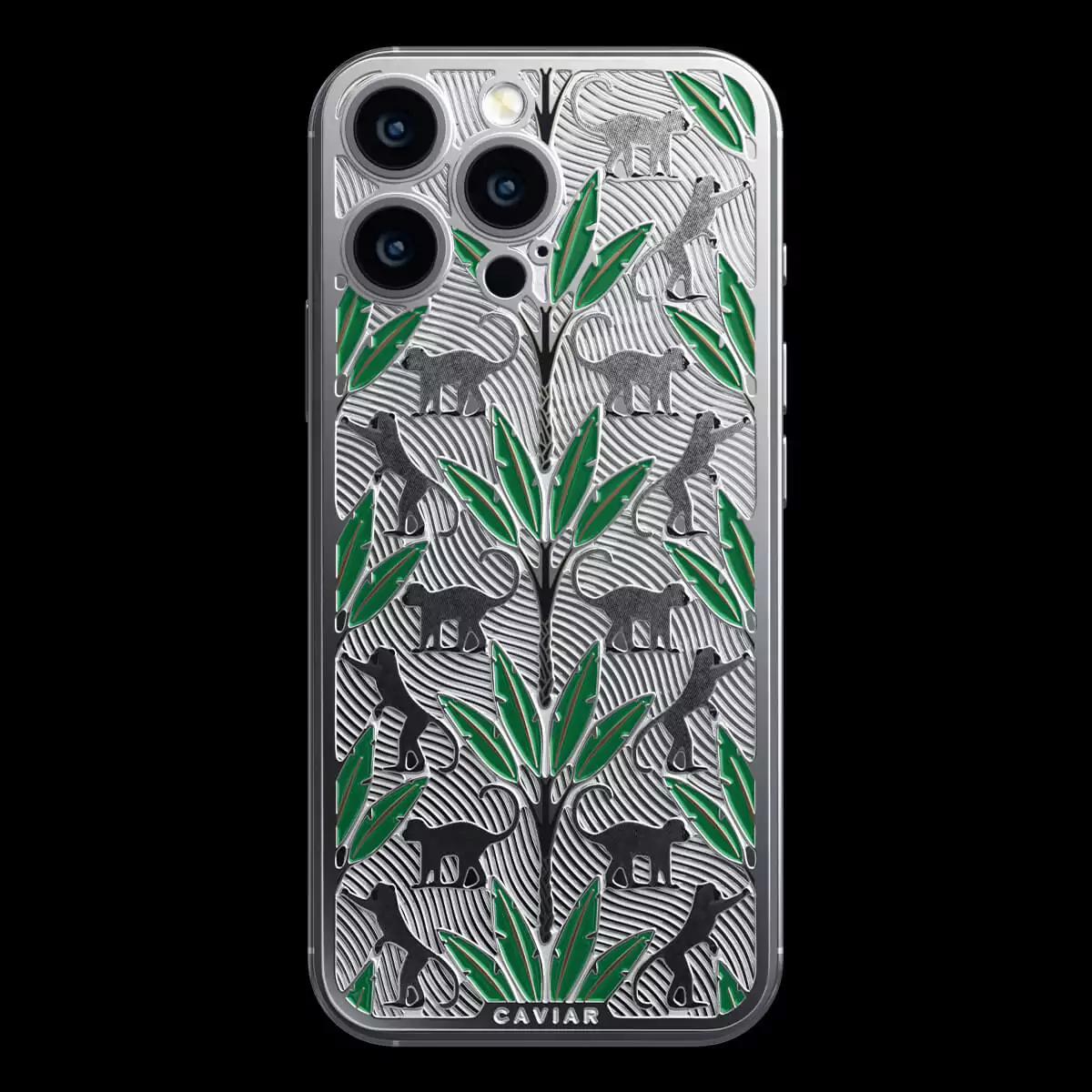 Титановая поверхность Gibraltar от Caviar словно высечена самой природой – на ней выгравированы гордые силуэты обезьян-маготов, которые стали символами этого места. Черные стволы пальм дополняют картину, а изумрудные эмалевые листья оживляют дизайн.