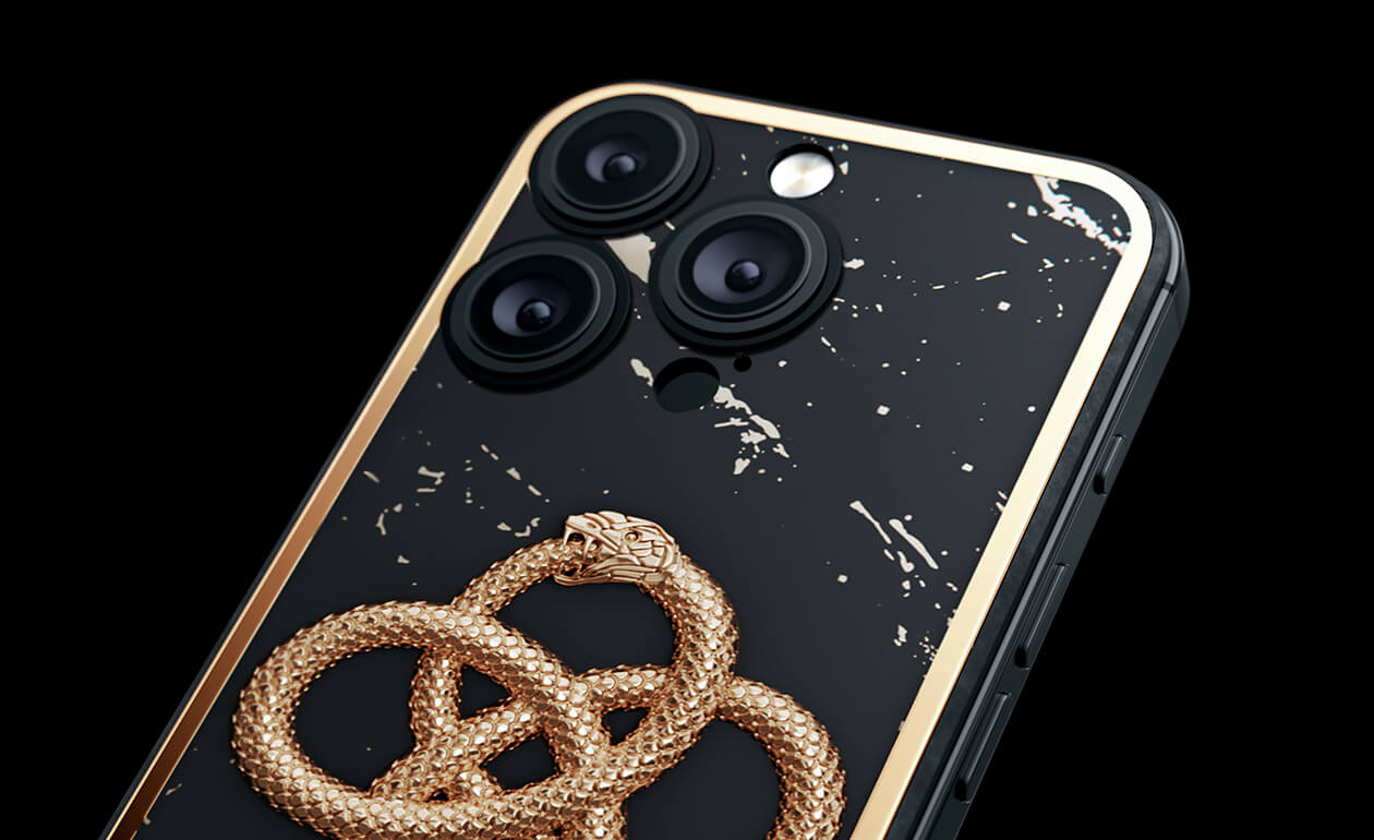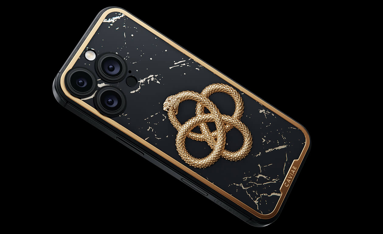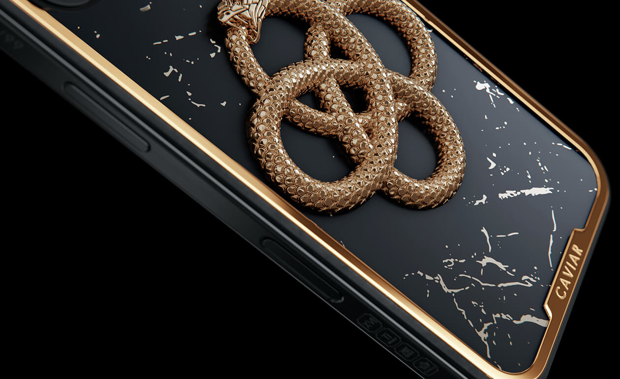 Caviar переносит этот легендарный образ в современность, превращая его в символ утонченного вкуса и вечных ценностей. Чешуйки змея переливаются 24-каратным золотом. Дизайн телефона передает философию бесконечности, сочетая ручную работу, инновационные материалы и элегантную роскошь.