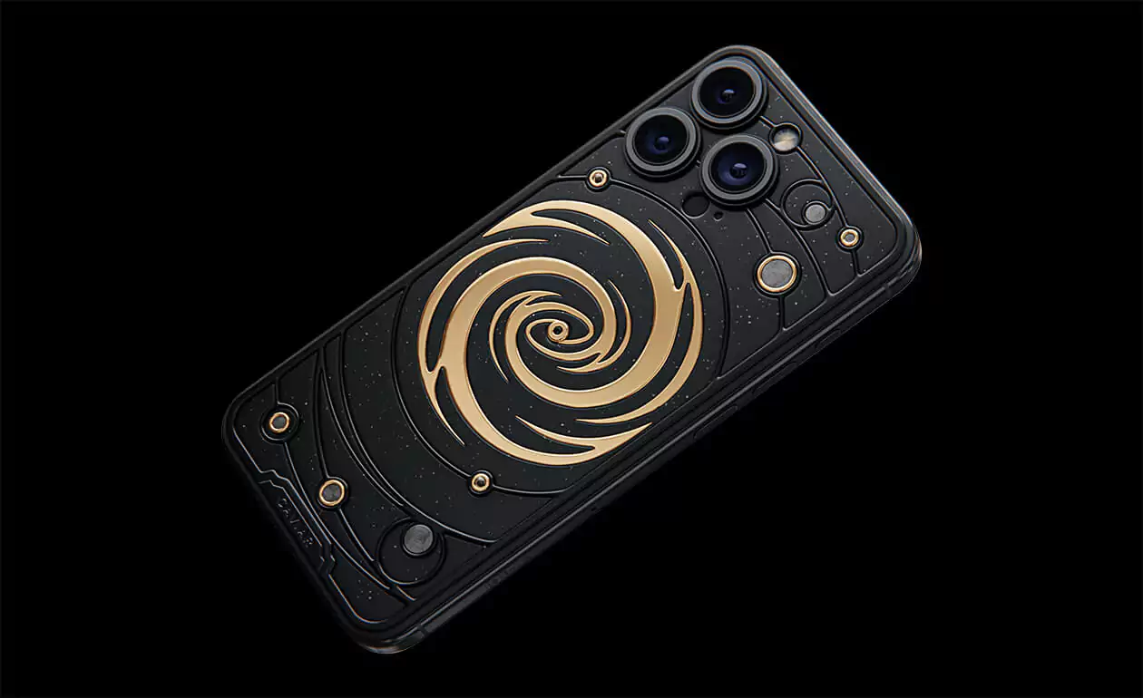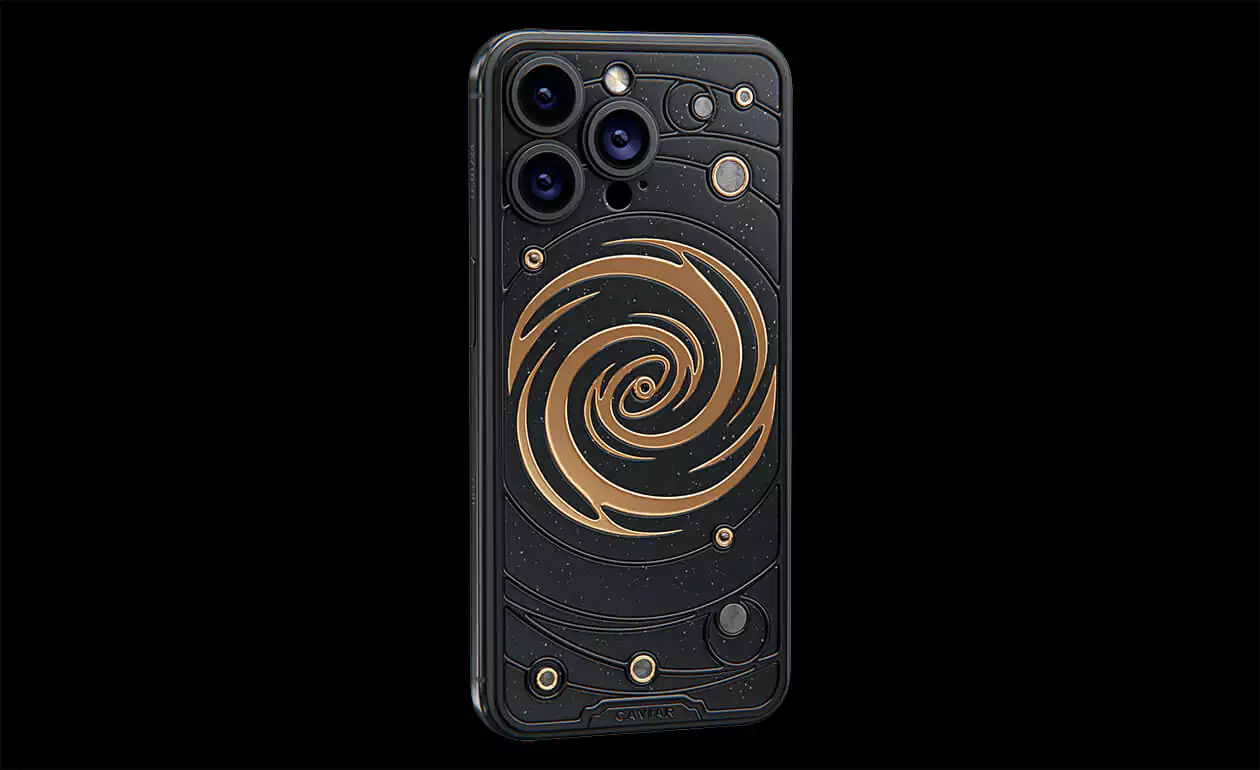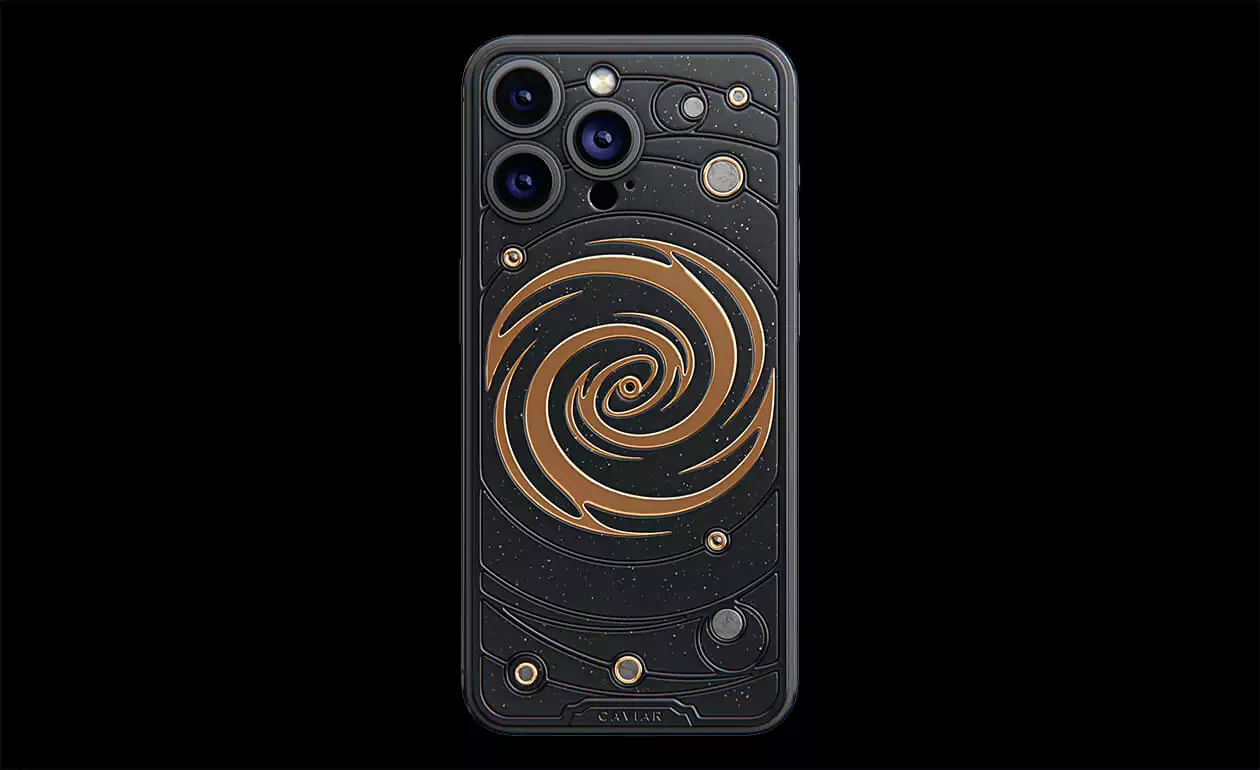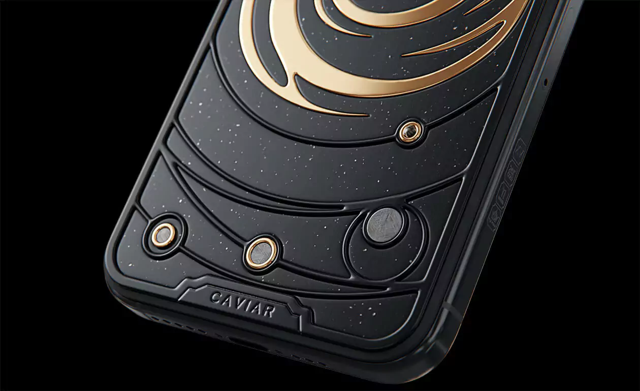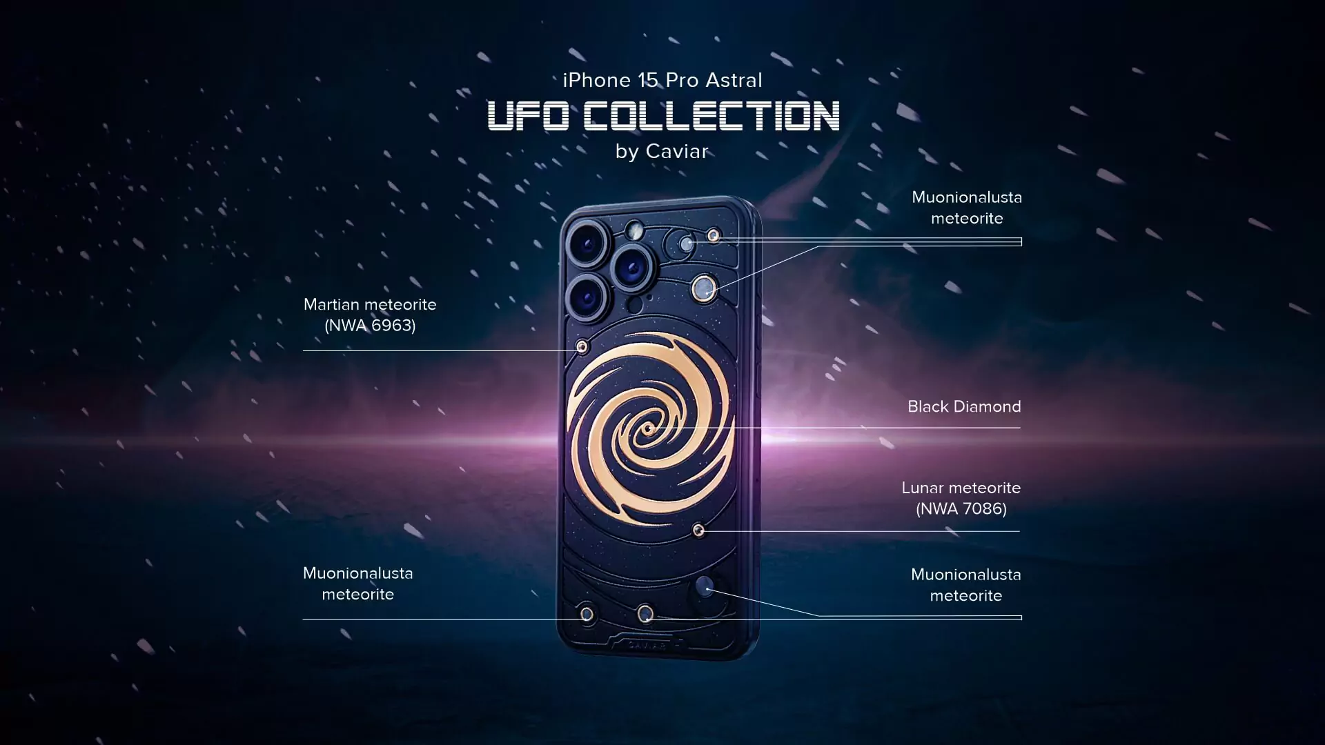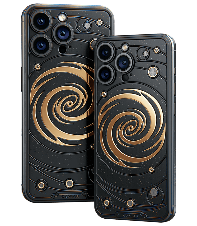 The power of revolving Universe on your phone. Caviar masters incrusted the phone with tiny pieces of ancient meteorites. One of them is Muonionalusta, the most ancient cosmic visitor aged at 4,5 billion years. The gold-plated spiral embodies our galaxy. Are we alone here? Think about it holding iPhone 15 Pro Astral in your hands.