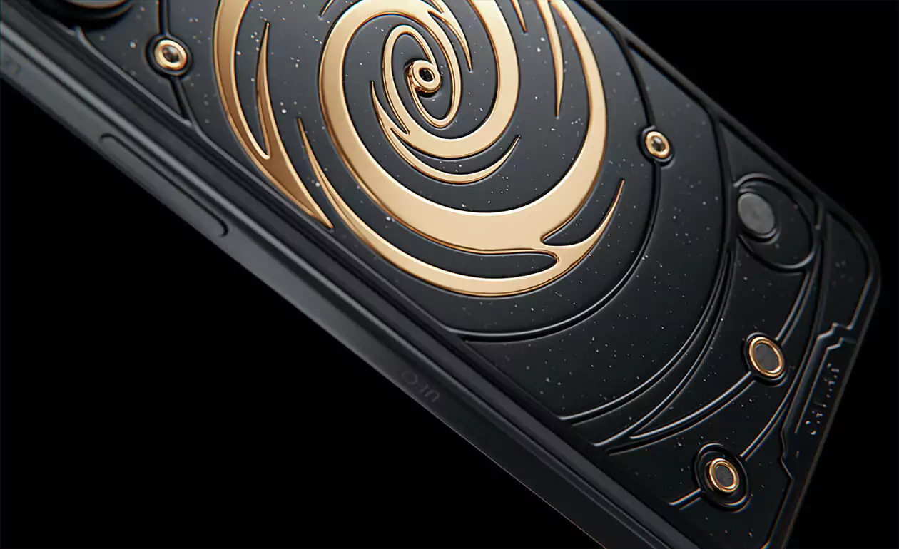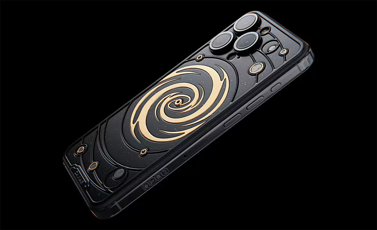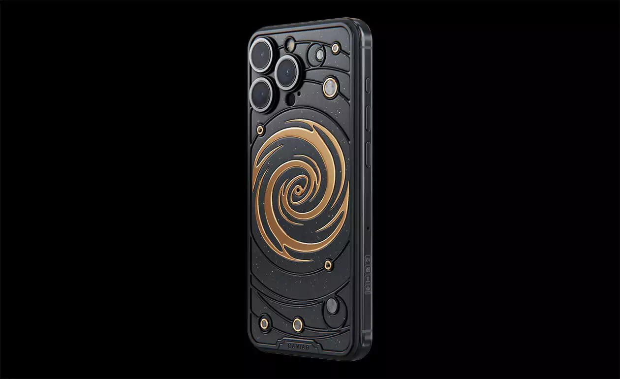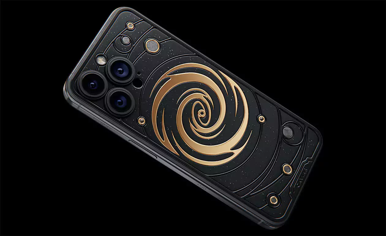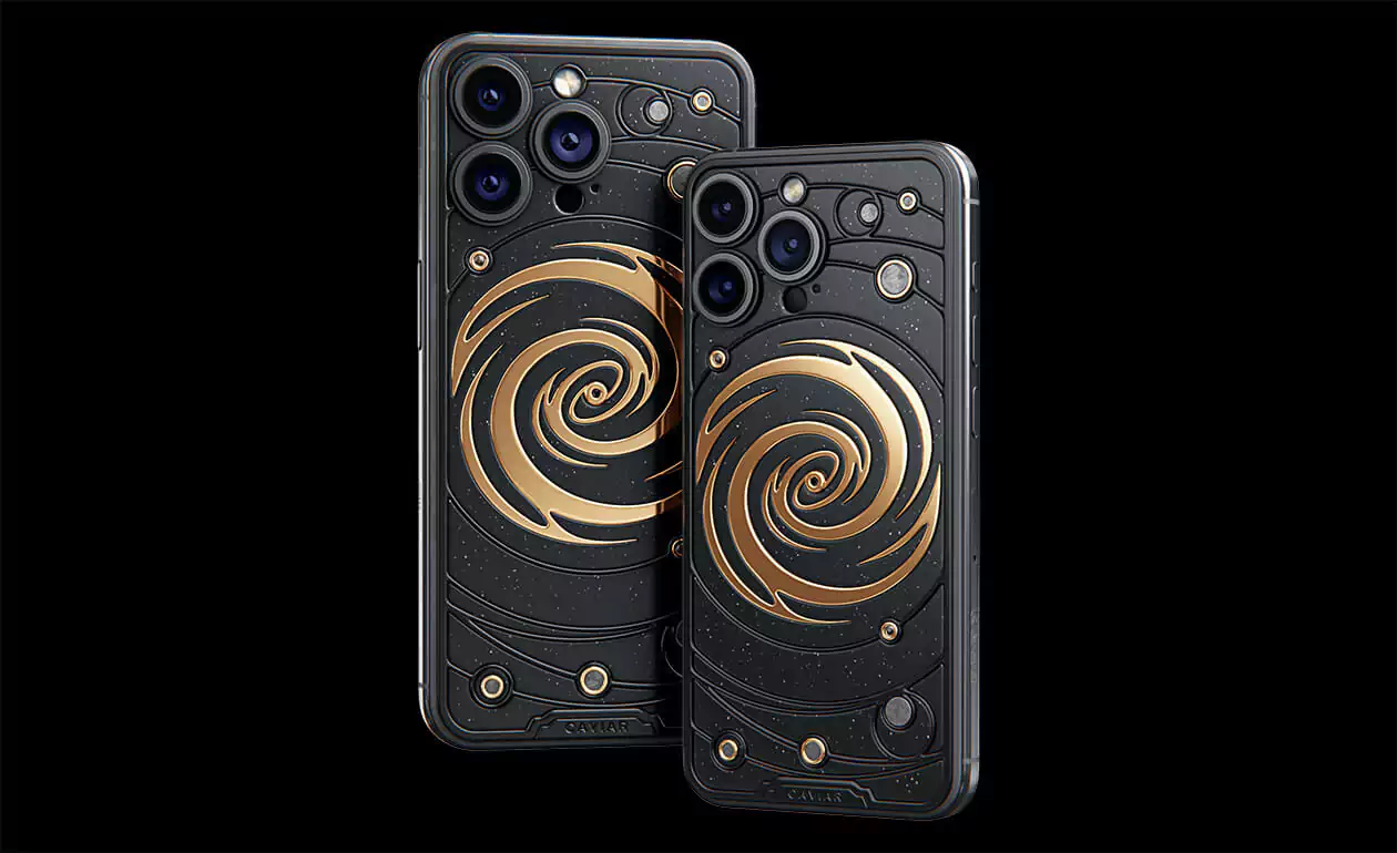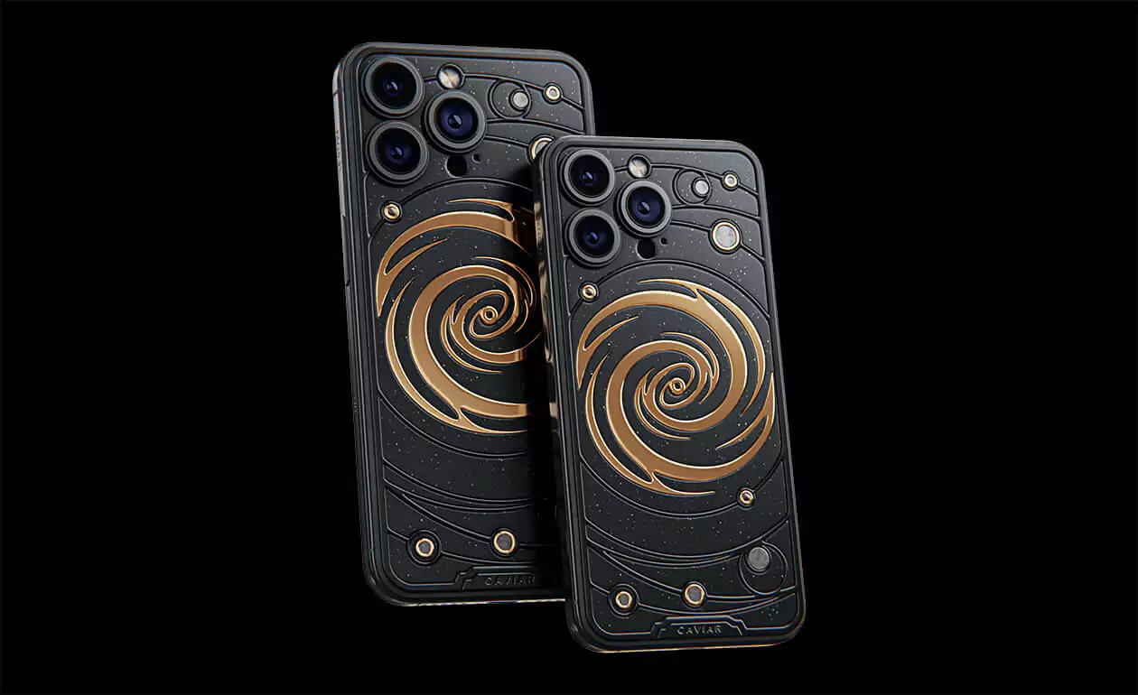 The power of revolving Universe on your phone. Caviar masters incrusted the phone with tiny pieces of ancient meteorites. One of them is Muonionalusta, the most ancient cosmic visitor aged at 4,5 billion years. The gold-plated spiral embodies our galaxy. Are we alone here? Think about it holding iPhone 15 Pro Astral in your hands.