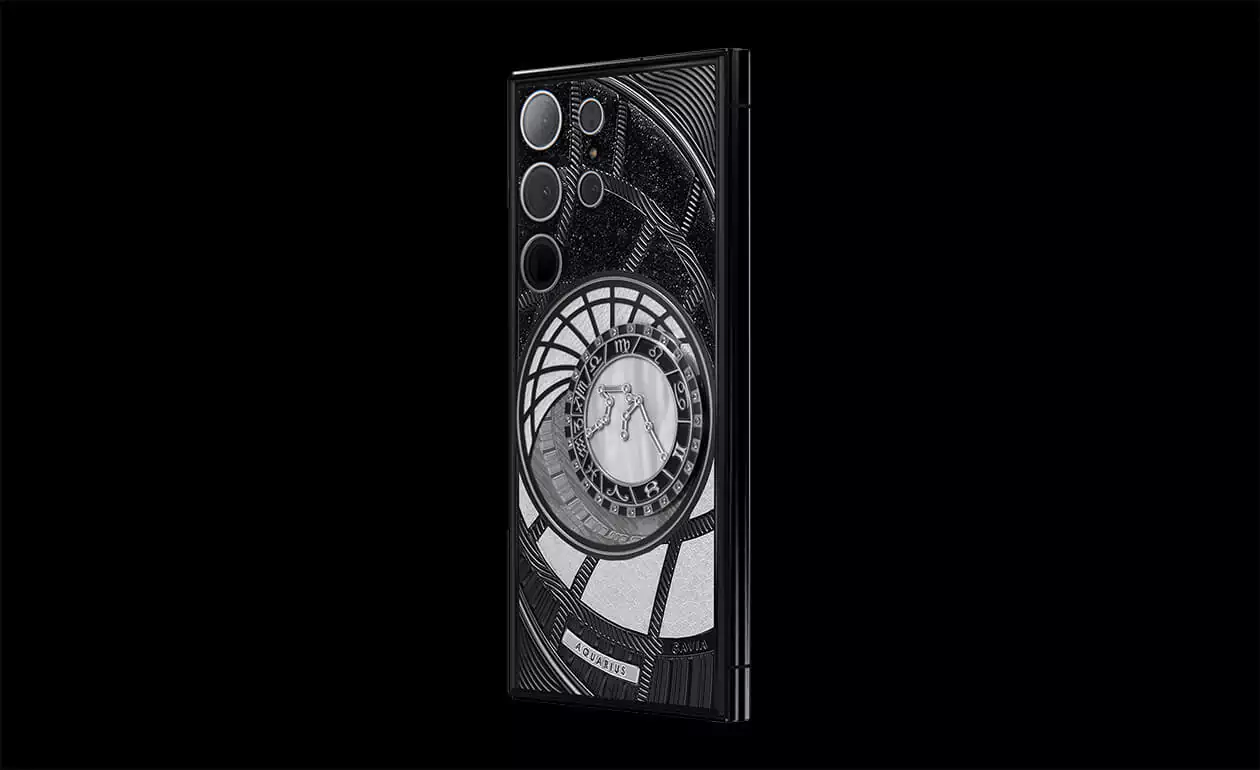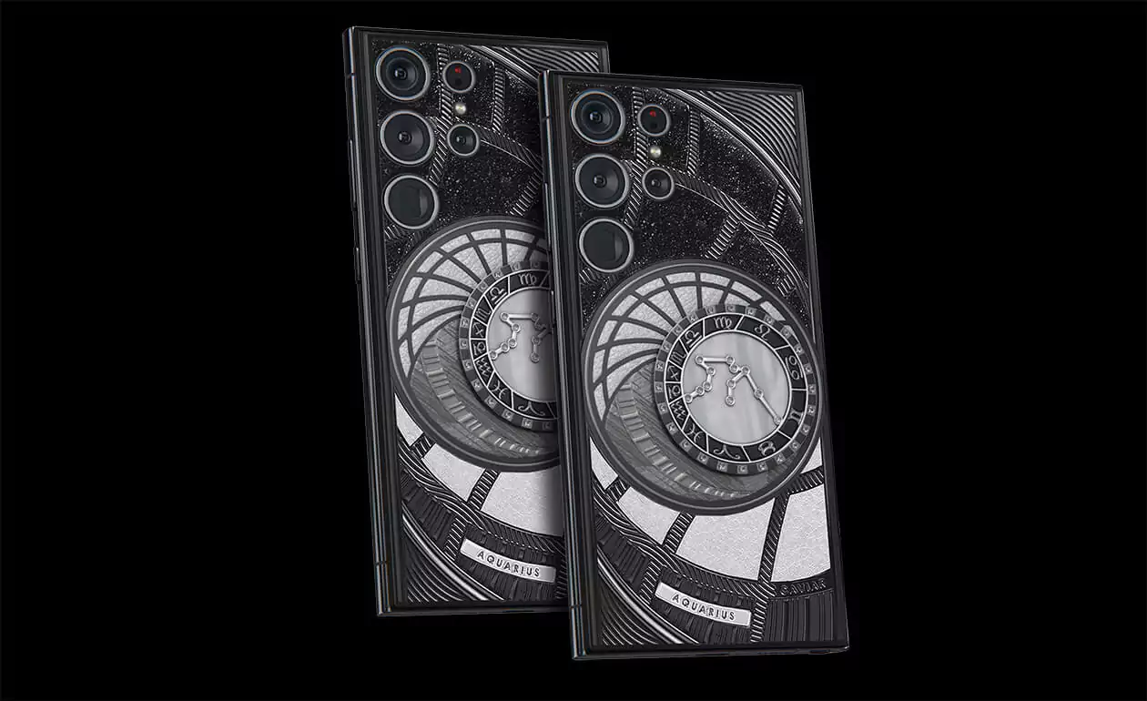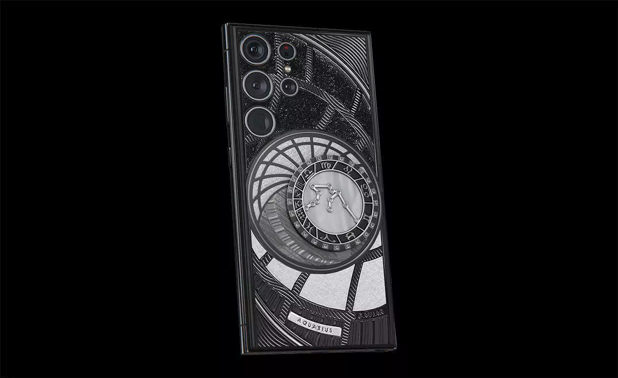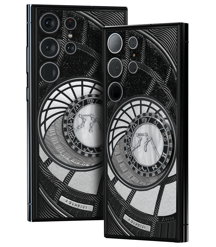 Водолеи, представляем вам Aquarius. На корпусе этого смартфона вы увидите небесный свод с изображением ваших звезд. Это панно, состоящее из 24 кристаллов Swarovski, создано на черном титане с PVD-покрытием. Мы подчеркнули блеск россыпи кристаллов, используя белый композит, а завершили композицию фрагментом метеорита на телячьей коже белоснежного цвета.