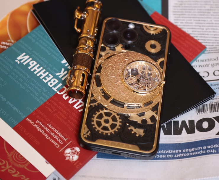 Черно-золотой корпус, скелетонизированные детали, динамика открытых шестерёнок — всё в этой модели говорит о сложности, точности и экстравагантной роскоши. Это не просто телефон. Это карманный манифест вкуса и исключительности.