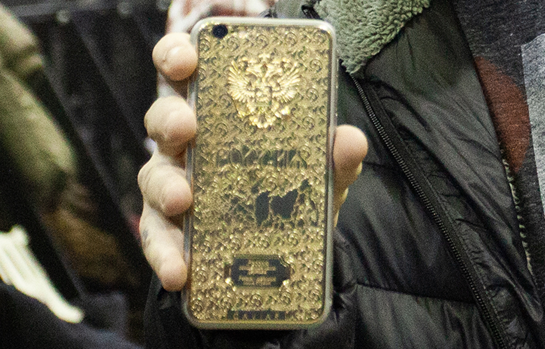- iPhone с российской символикой — покрытый золотом смартфон с изображением двуглавого орла, щита и узоров в духе имперской эстетики.
