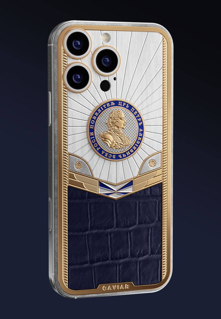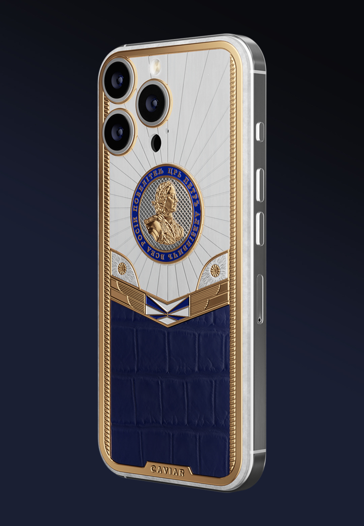 Посвящение реформатору, стратегу и императору, открывшему России путь в Европу. Дизайн навеян эстетикой петровских времен: узоры, вдохновленные Петергофом, военно-морская символика и образ двуглавого орла. Мастера Caviar переосмыслили образ монеты 1721 года, чтобы поместить ее в дизайн кастомного iPhone. Цвета Андреевского флага, крокодиловая кожа и редкие материалы придают модели имперскую величественность.