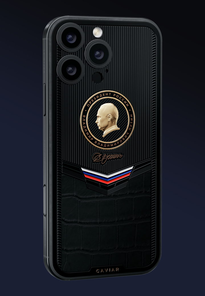Модель, созданная в знак уважения к лидеру, чьё имя стало символом национального единства. Чёрный титан с геометричным силуэтом, покрытие из золота и вставки из крокодиловой кожи подчеркивают статус и точность образа. На задней панели — флаг России, сделанный из ювелирной эмали и факсимиле подписи Президента. Центральный элемент — объёмный золотой профиль Владимира Путина, покрытый двойным слоем 24-каратного золота.