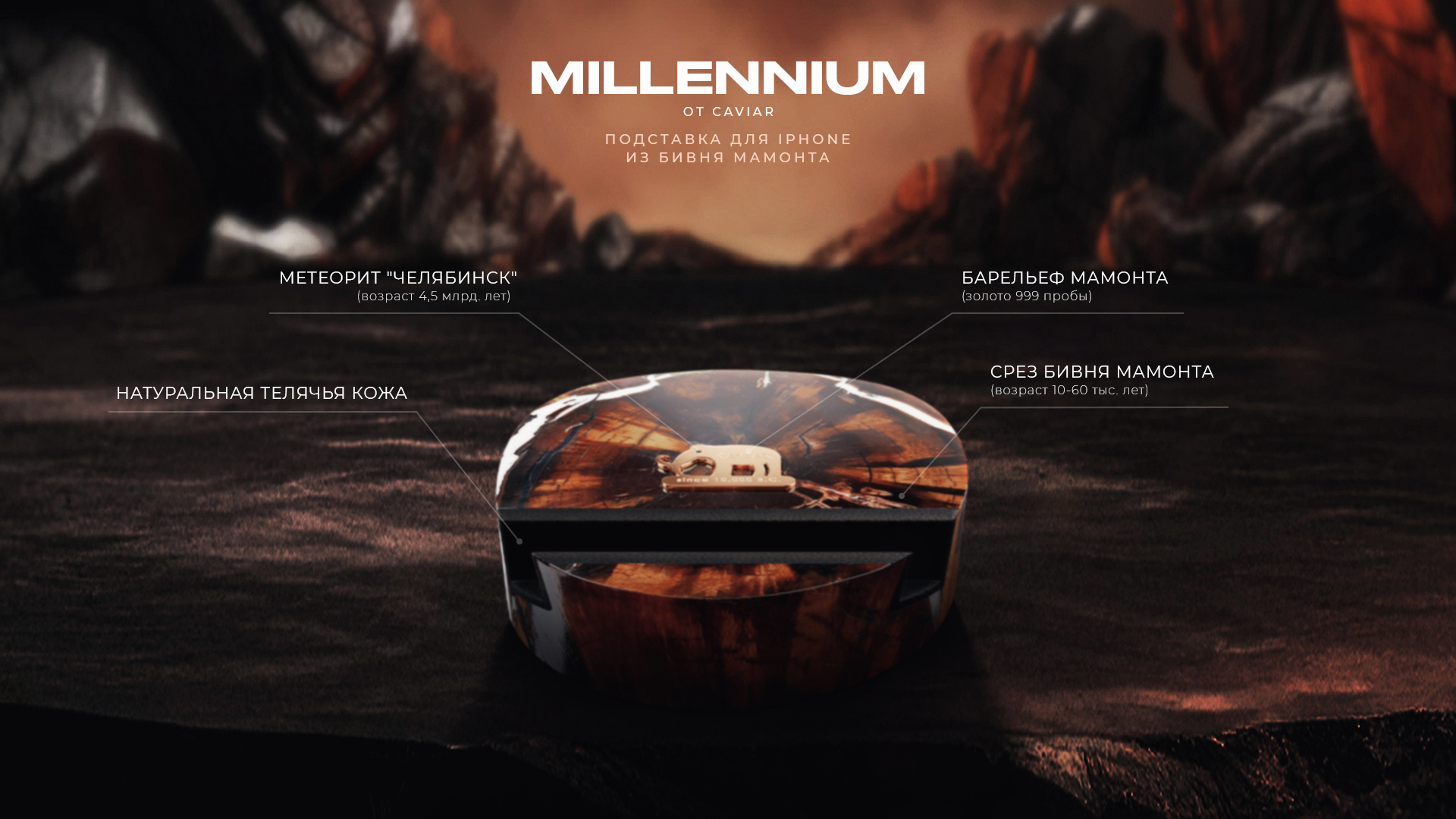 Caviar представил на сайте необычную подставку “Millennium” для iPhone 16 Pro, полностью сделанную из бивня мамонта возрастом 10 000 лет. Она украшена золотым барельефом животного и фрагментом Челябинского метеорита. Стоимость Millennium доходит до 200 000 рублей.
