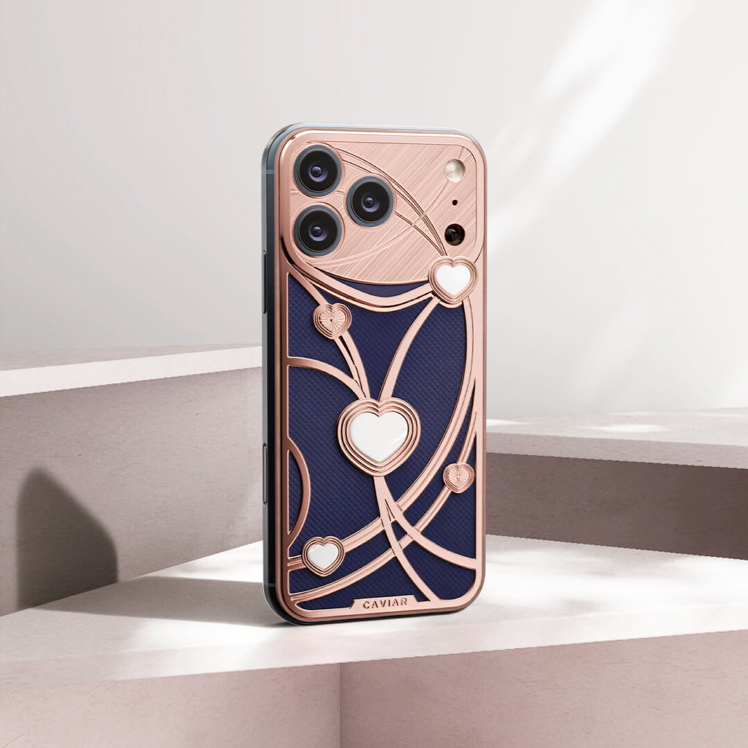Dancing Hearts украшен сердцами из перламутра и золота. Плавные линии декора создают эффект танца сердечек на корпусе смартфона.
