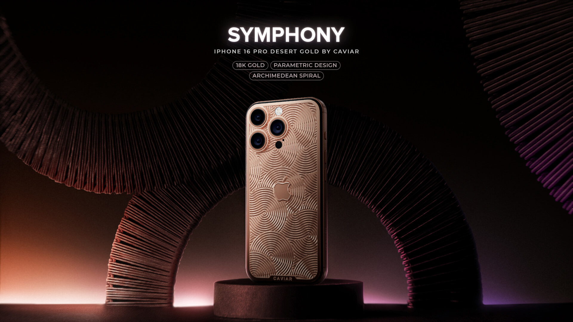 Корпус Symphony украшен параметрическим орнаментом, характерным для современной архитектуры, включая стадион Аль-Вакра в Катаре и комплекс Galaxy SOHO в Пекине по проектам знаменитого архитектора Захи Хадид. При его создании бренд использовал красное золото в особом оттенке Desert Gold, повторяющем цветовую опцию Desert Titanium от Apple. Красное золото повсеместно называют “русским” из-за ассоциации с российской ювелирной промышленностью.