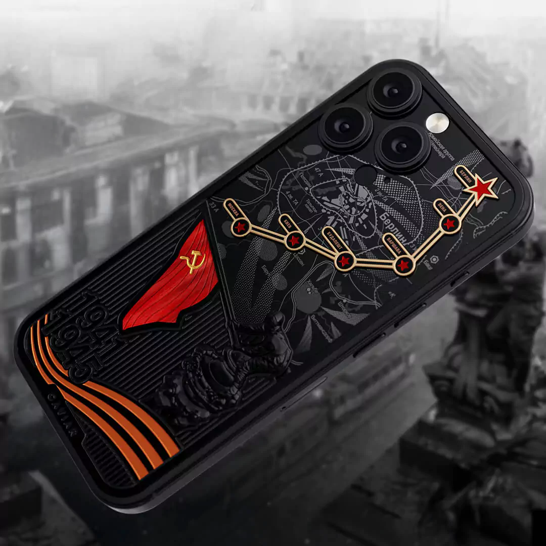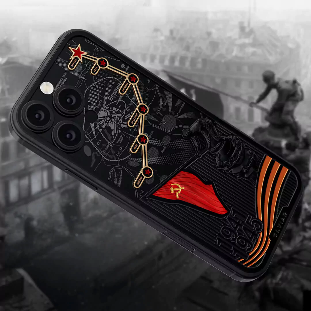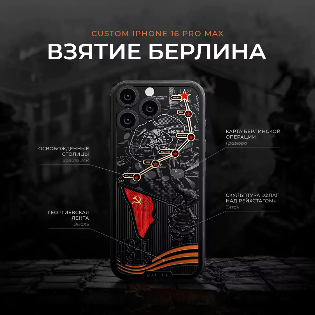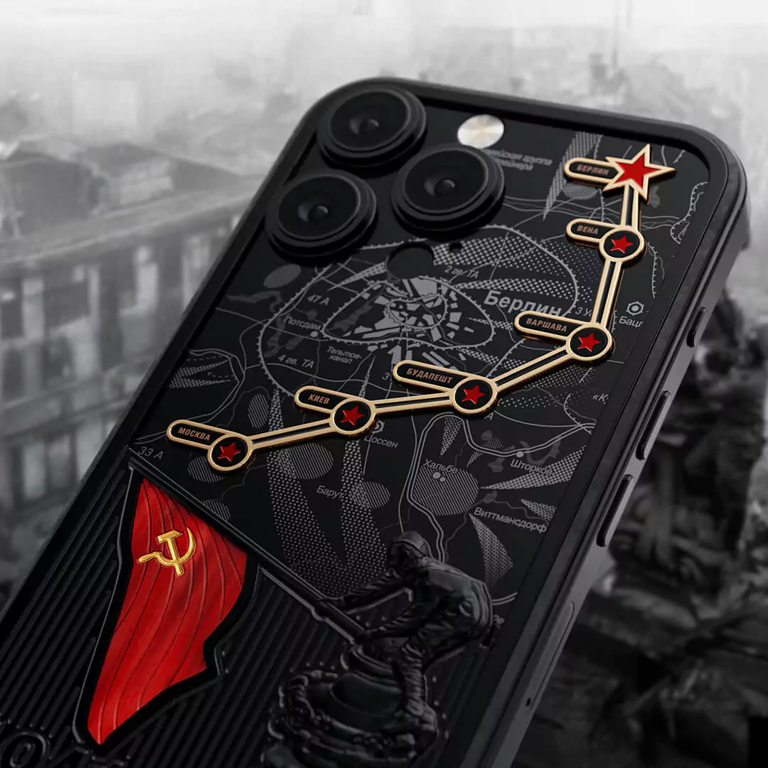 Кастомный iPhone "Взятие Берлина" — это памятник историческим событиям, ставшим символом свободы и победы. На корпусе устройства изображен путь, который прошла Красная Армия к Победе с отмеченными столицами — Москва, Киев, Варшава, Будапешт, Вена и Берлин. Тончайшая гравировка, ювелирная эмаль и покрытие золотом 999 пробы оживляют эти исторические вехи, превращая корпус в карту героизма и памяти.