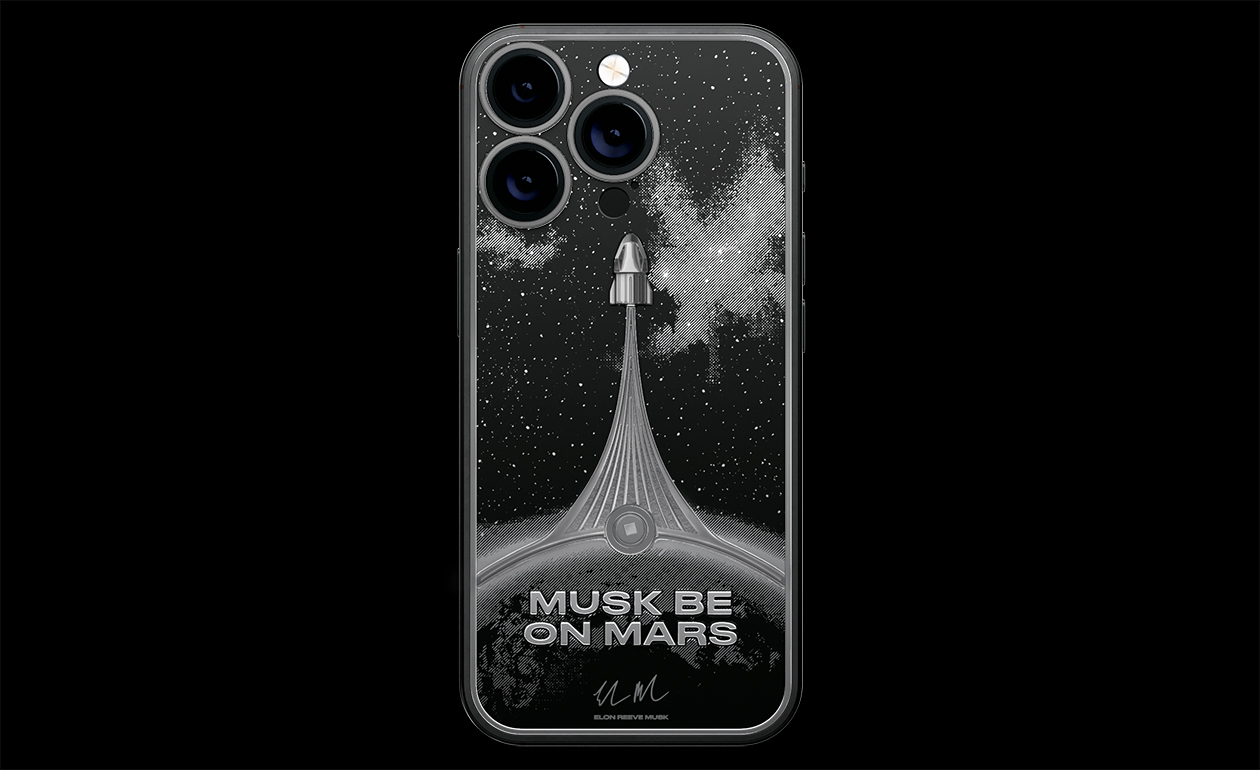 Вторая модель коллекции является обновленной версией культового кастома бренда “Musk Be On Mars”, посвященного Илону Маску – миллиардеру, основателю SpaceX и одному из самых известных сторонников Трампа. Телефон украшен изображением космического корабля, взмывающему ввысь. Главный элемент дизайна – аутентичный фрагмент космической миссии SpaceX, встроенный в корпус iPhone.