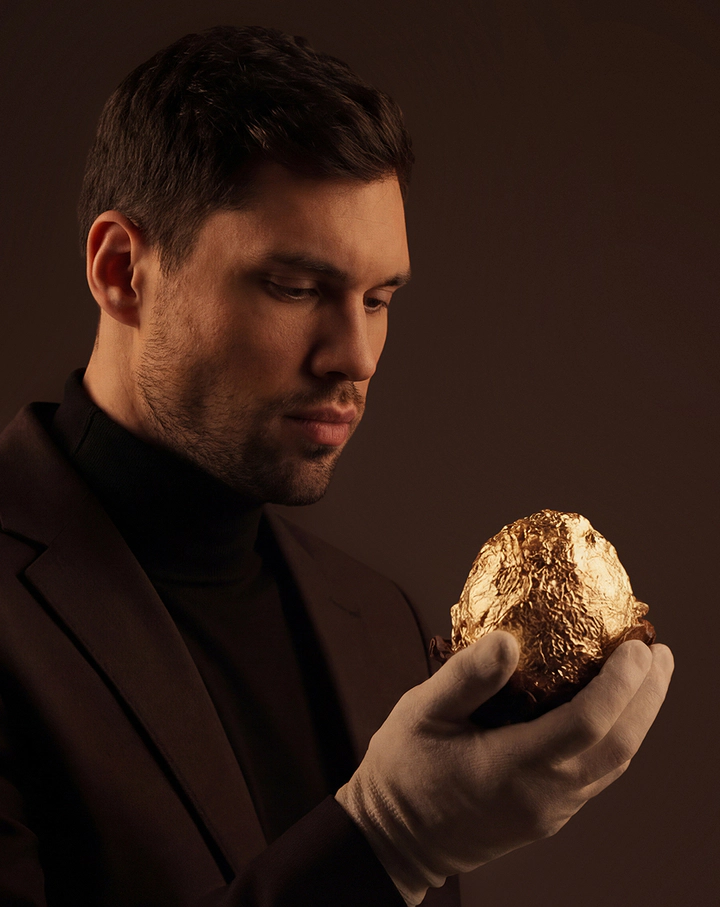 Фактурная поверхность яйца подчёркивает ручную работу, материальность и вес жеста.